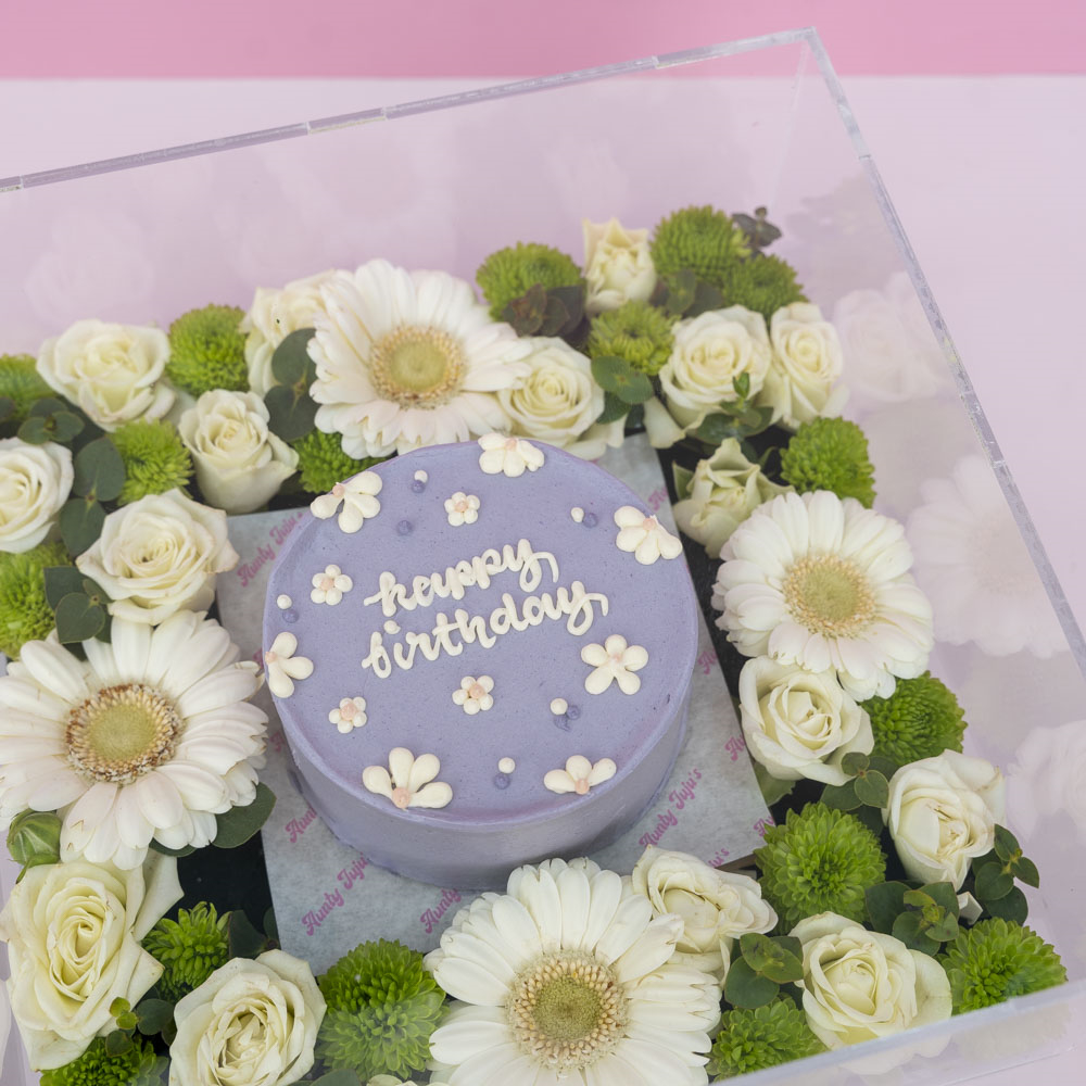 صينية أكريليك تحتوي على كيكة بينتو الشوكولاتة بقياس 4-انش، مزينة بمزيج من الزهور.