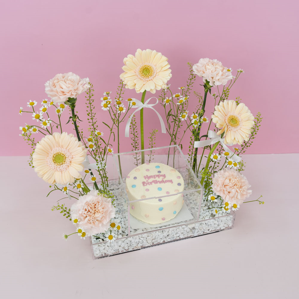 صينية أكريليك تحتوي على كيكة بينتو الشوكولاتة بقياس 4-انش، مزينة مع 3 من أزهار الجربيرا و 4 من الكارنيشن.