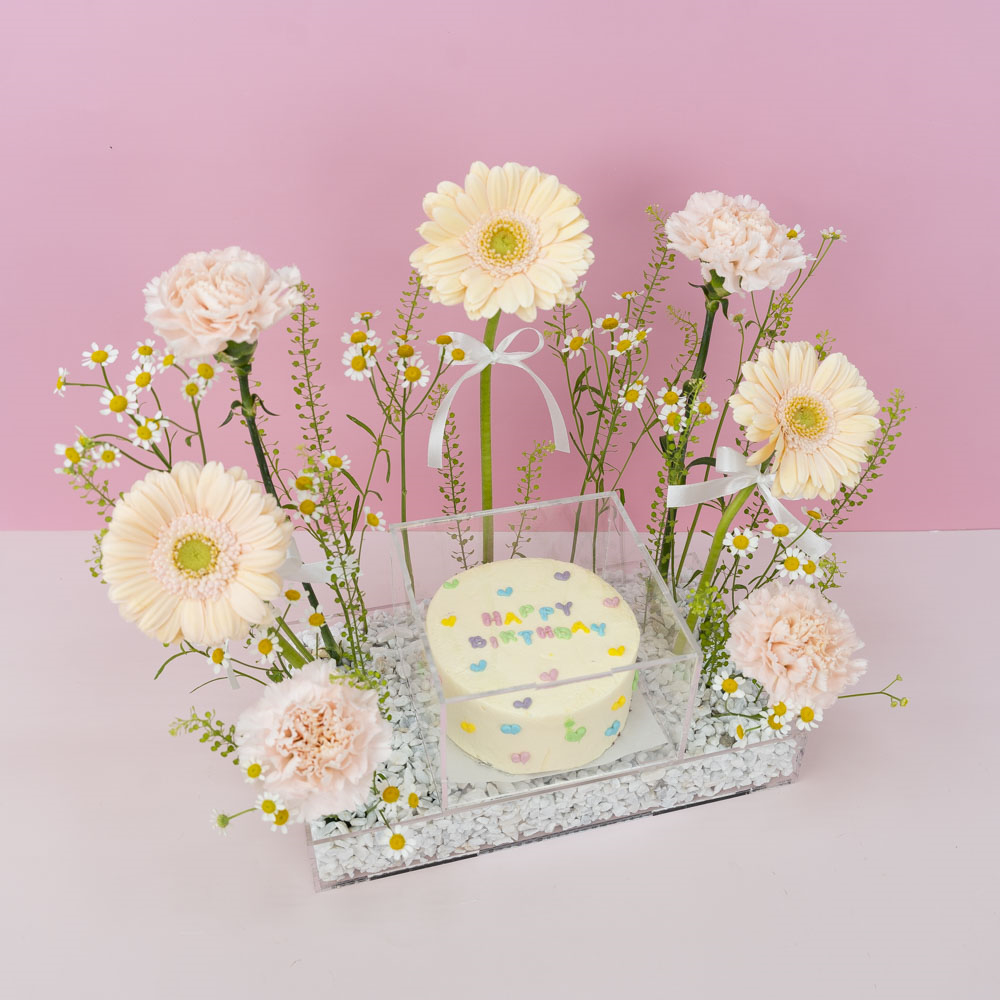 صينية أكريليك تحتوي على كيكة بينتو الشوكولاتة بقياس 4-انش، مزينة مع 3 من أزهار الجربيرا و 4 من الكارنيشن.