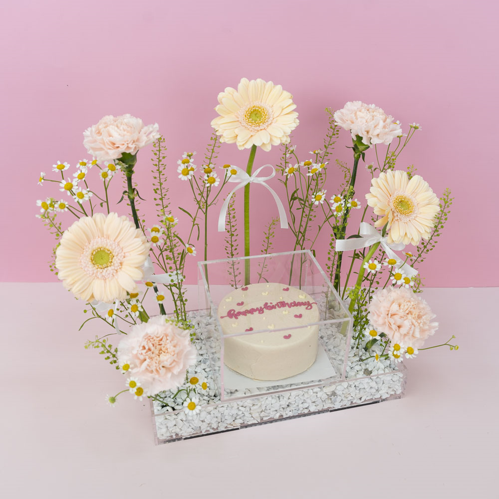 صينية أكريليك تحتوي على كيكة بينتو الشوكولاتة بقياس 4-انش، مزينة مع 3 من أزهار الجربيرا و 4 من الكارنيشن.