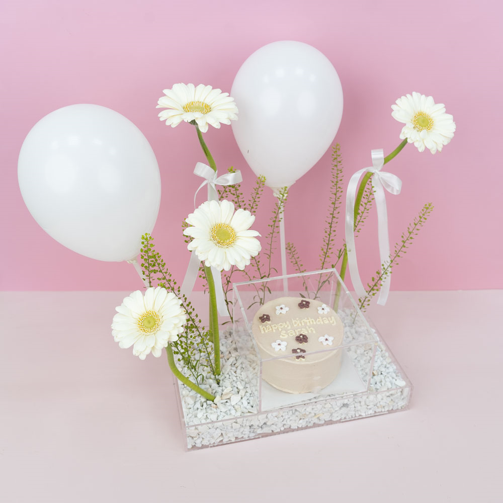 صينية أكريليك تحتوي على كيكة بينتو الشوكولاتة بقياس 4-انش، مزينة مع 4 أزهار الجيربيرا و بالونتين.