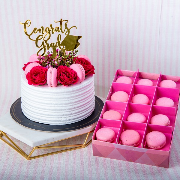 كيكة إسفنجية مع جبنة كريمية وكريمة مخفوقة مزينة عالية الجودة والماكرون مع علبة 12 حبة ماكرون مع 4 نكهات.