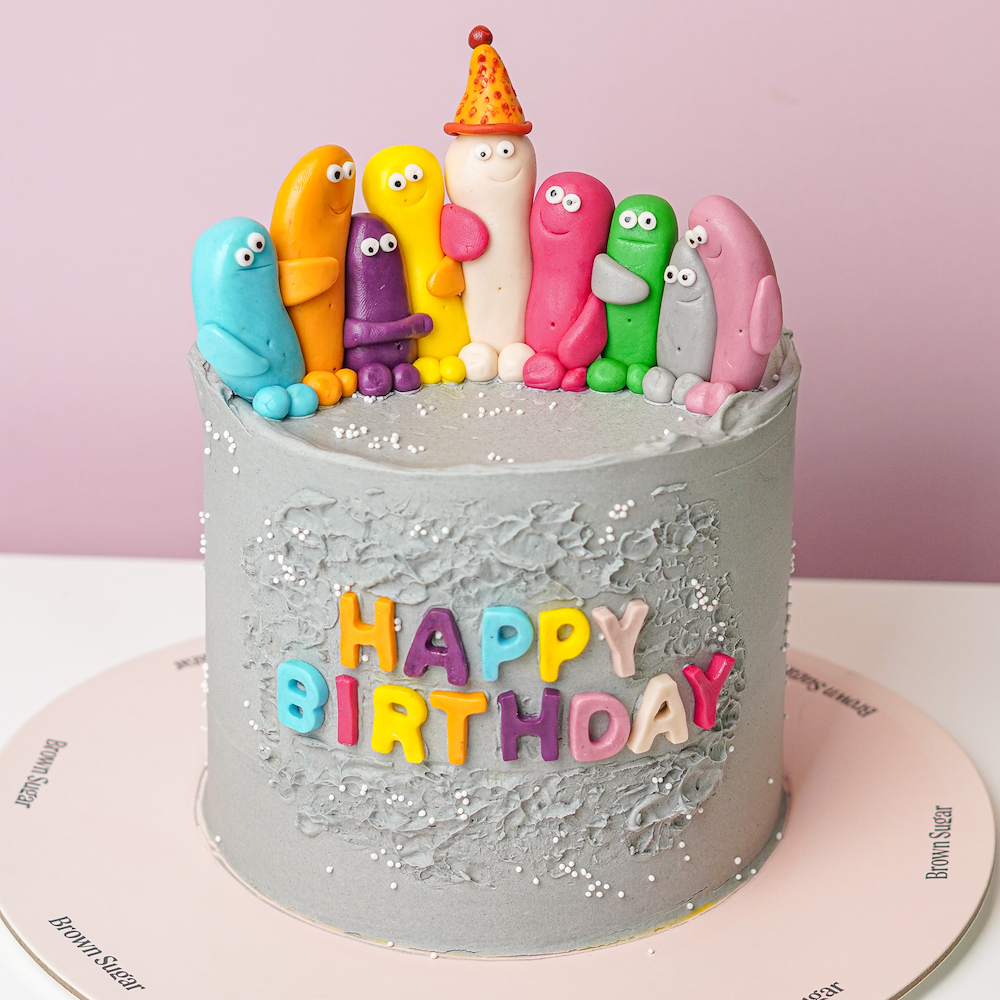 كيكة مرحة مليئة بالألوان، مع شخصيات من الفوندان مجتمعين بتصميم إحتفالي. مغطاة بكريمة باللون الرمادي بملمس ناعم وحروف ملوّنة بعبارة “Happy Birthday”، إختيار يضيف لمسات جميلة لأي إحتفال.