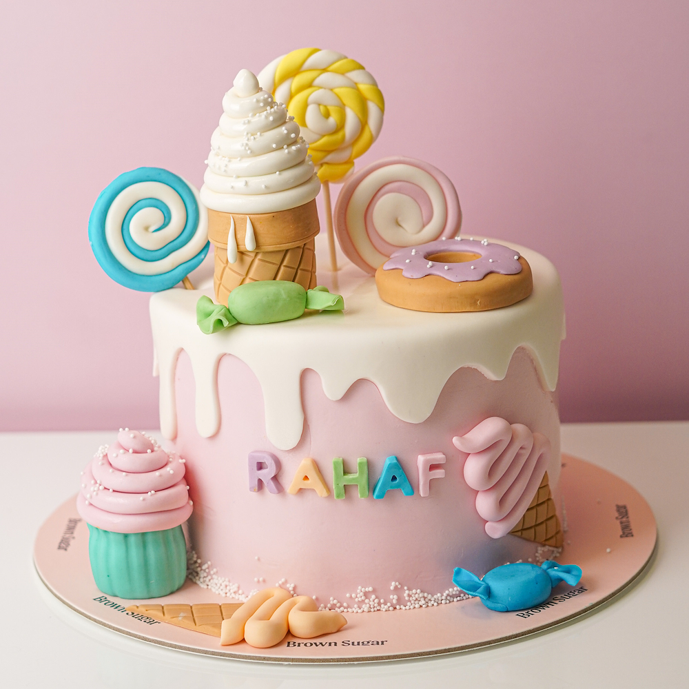 كيكة مبهجة مزينة بحلويات فوندان مثل المصاصات والآيس كريم والكب كيك والحلوى.