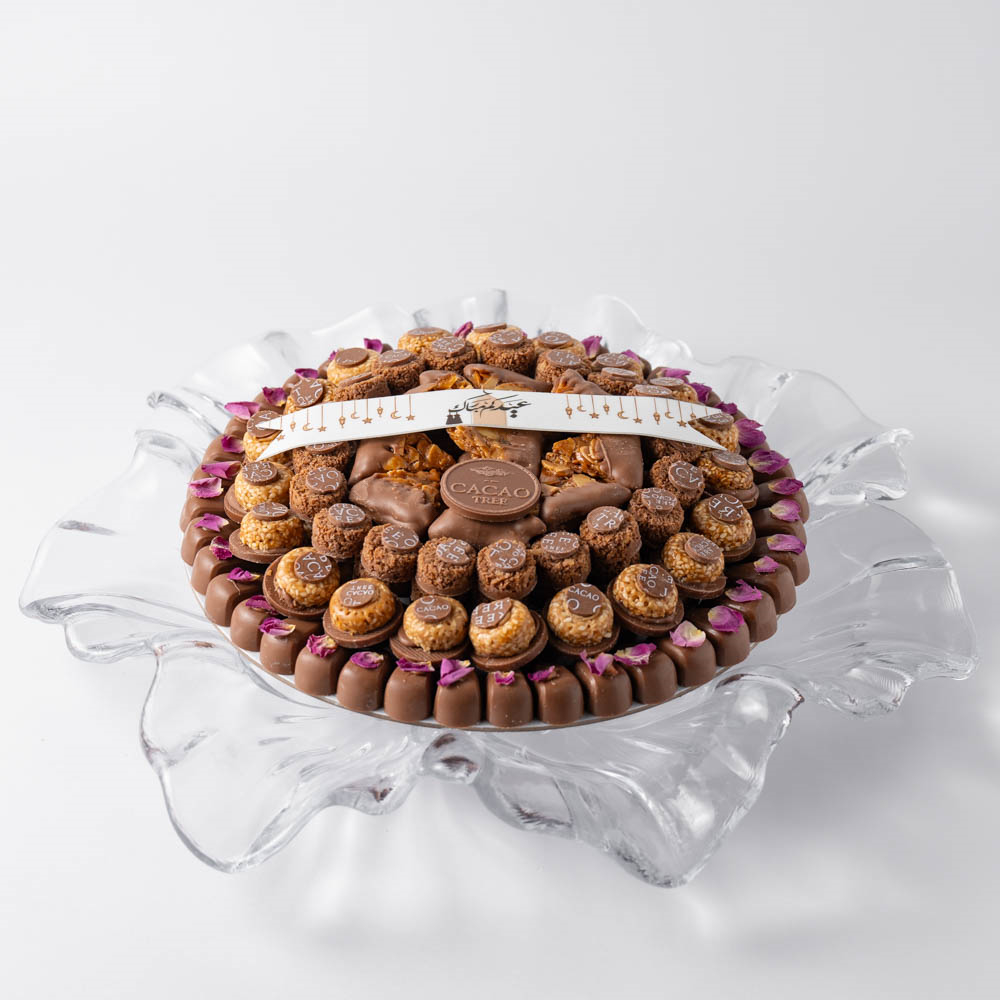 صينية زجتجية تحتوي على شوكولاتة الغاناش بحشوات اللوتس بالسمسمية، الكراميل المملح والكراميل بالبيكان.