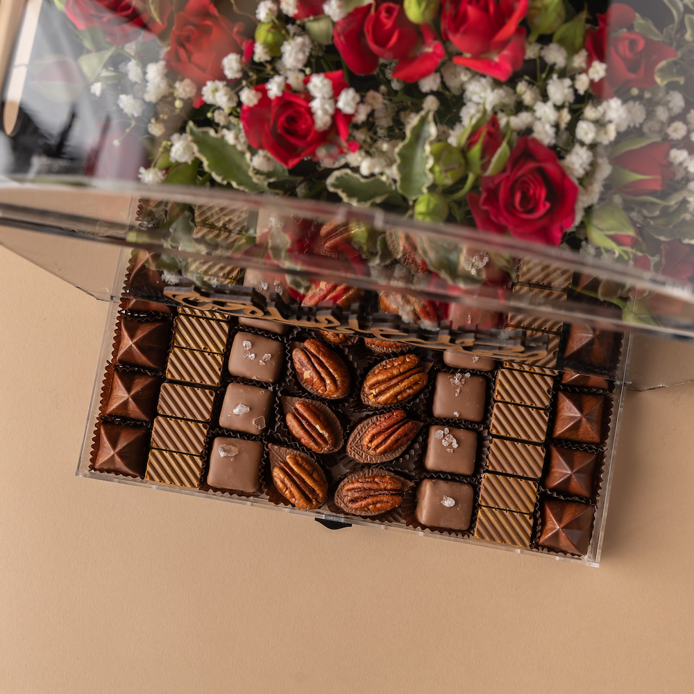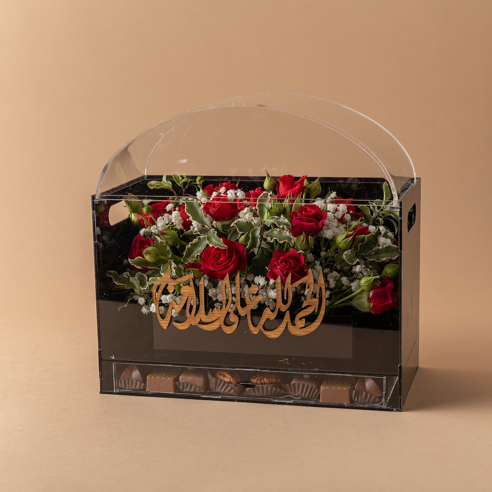 بوكس أكريليك فاخر مزين بأزهار ولمسات بيضاء أنيقة مع الشوكولاتة الفاخرة وتوبر خشبي أنيق، هدية تعبّر عن الاهتمام والدفء والأمنيات الصادقة.