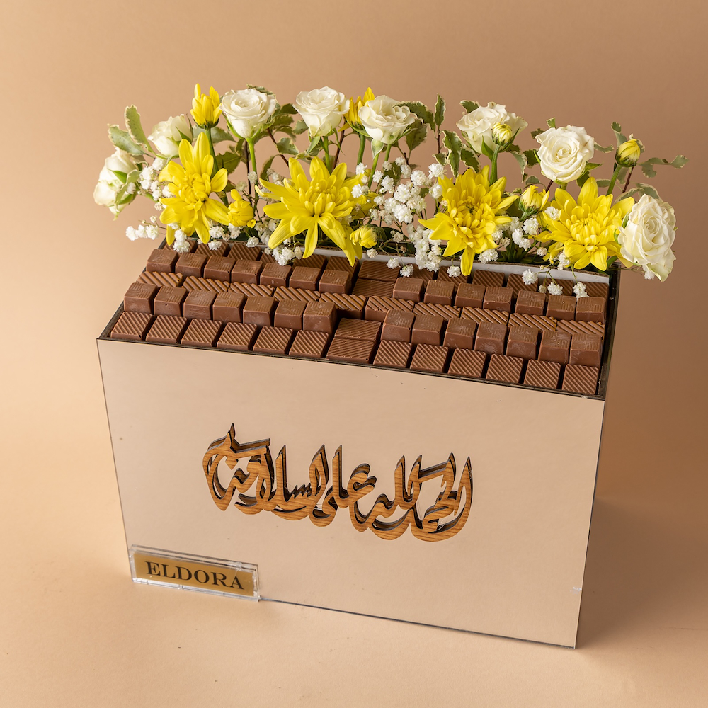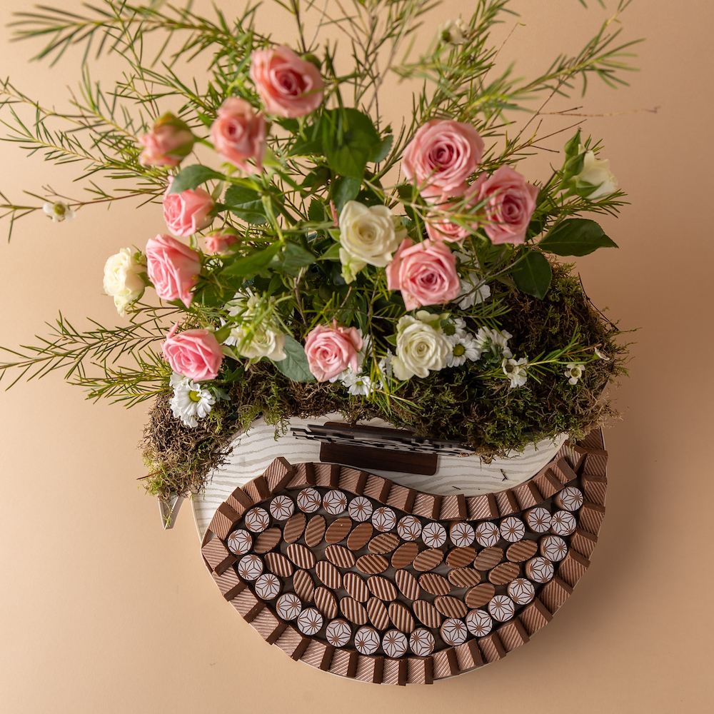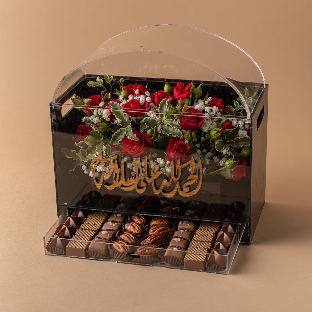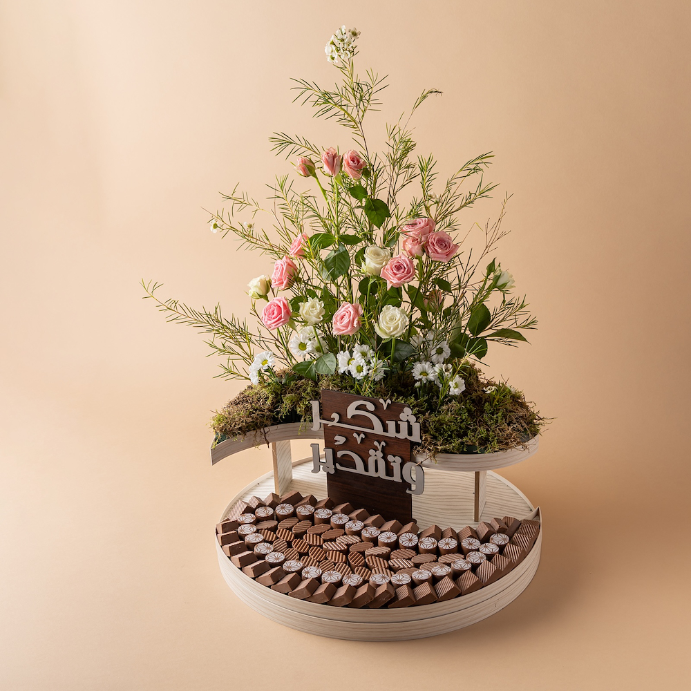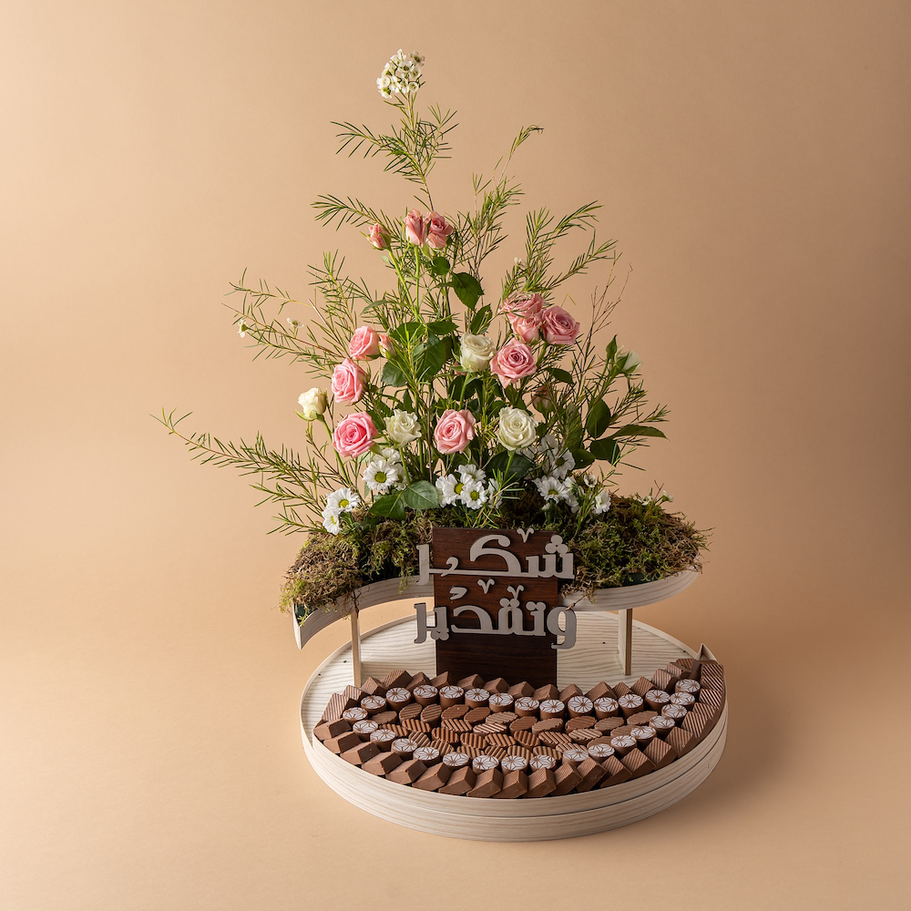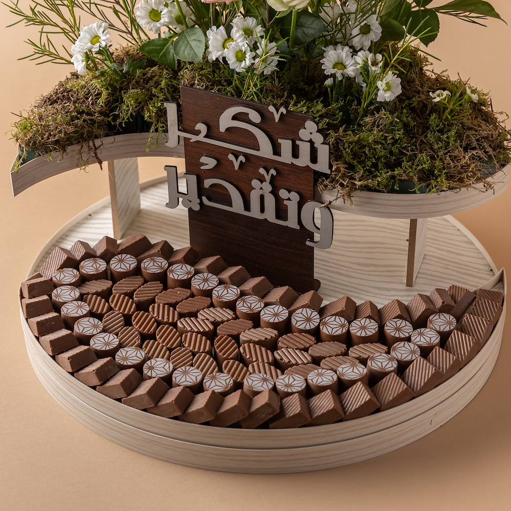 صينية فاخرة بتصميم فني يجمع بين الطبيعة والشوكولاتة البلجيكية، مزودة بعبارة خشبية "شكر وتقدير" تجعلها هدية معبّرة ولائقة بكل مناسبات الشكر.