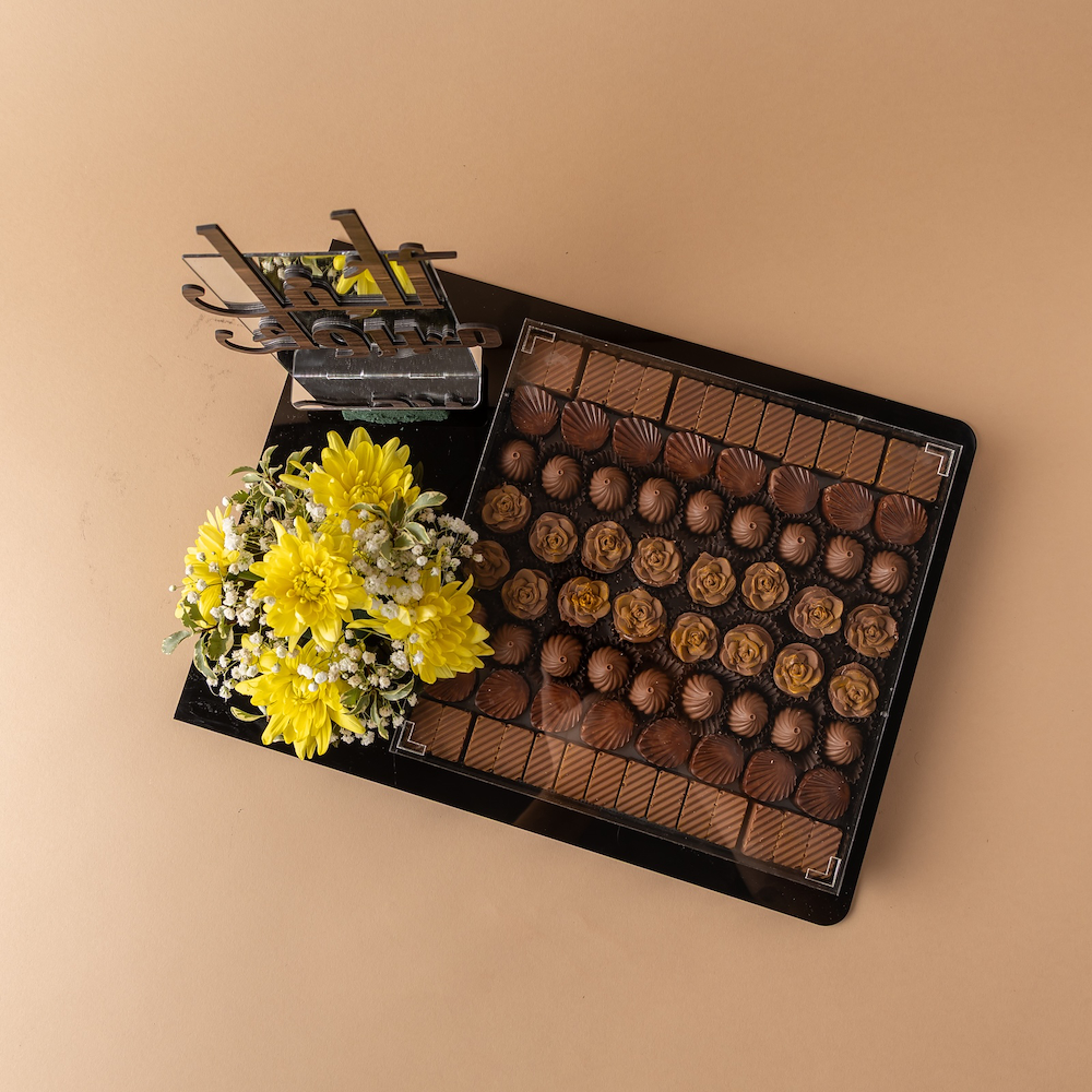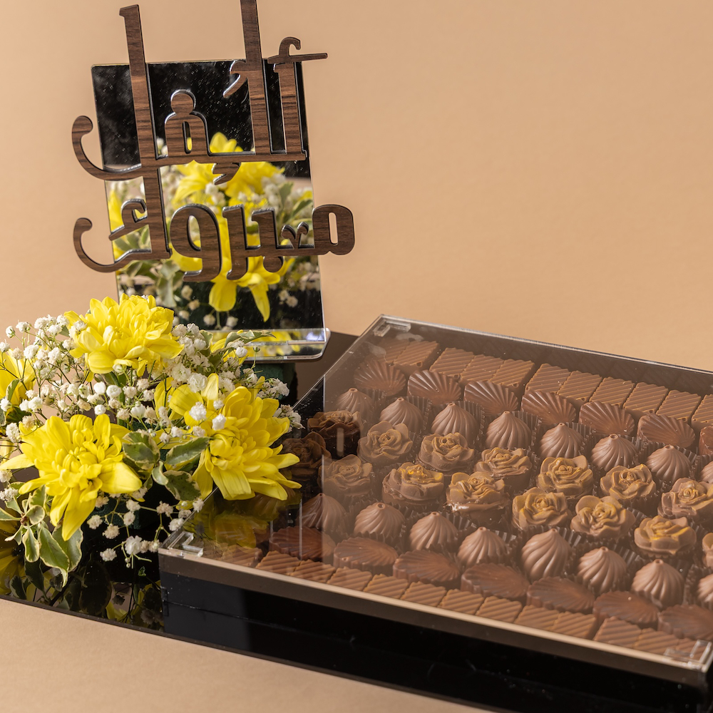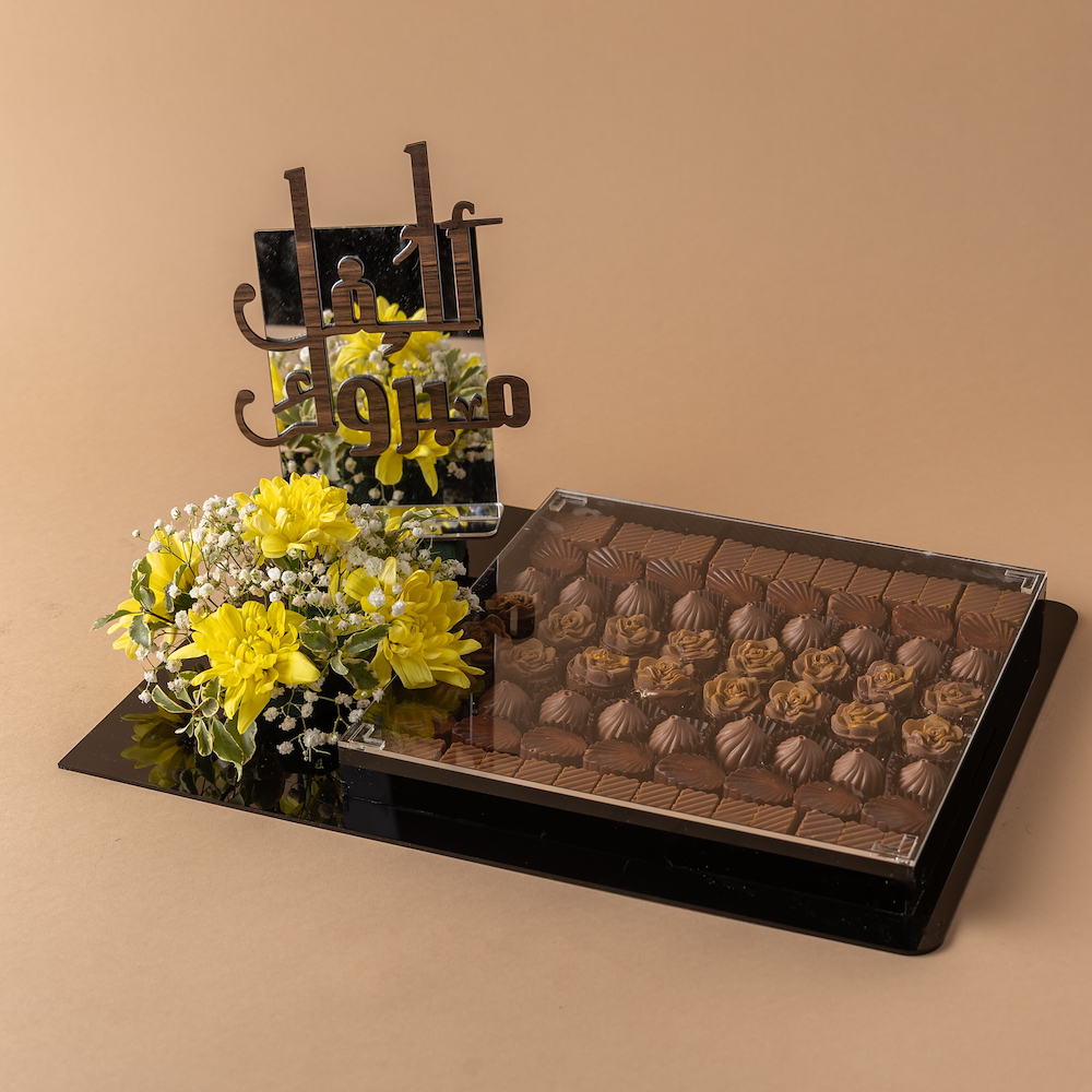 بوكس أكريليك راقٍ مزين بالزهور الطبيعية ويضم تشكيلة من الشوكولاتة الفاخرة، تتوسطه عبارة خشبية “ألف مبروك”، ليكون هدية فاخرة تعبّر عن الفرح والتهنئة بكل مناسبة سعيدة بلمسة أنيقة ومميزة.