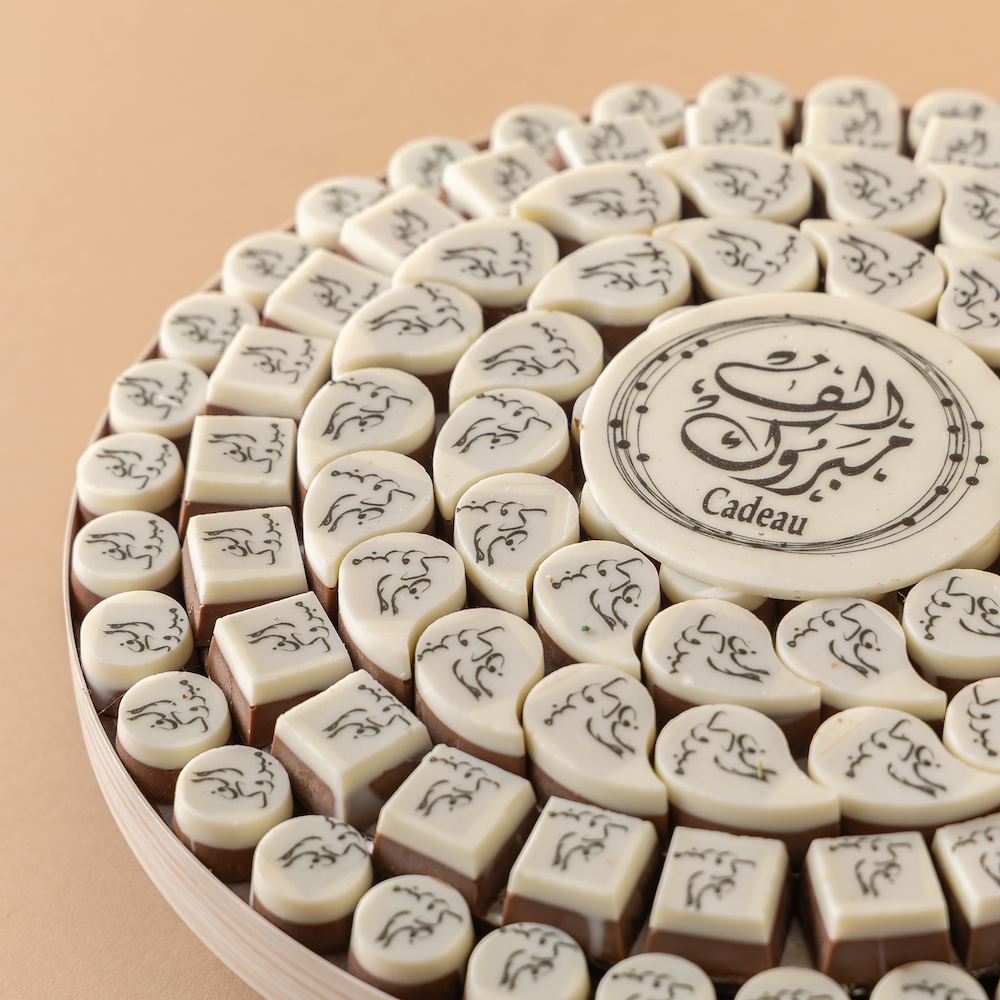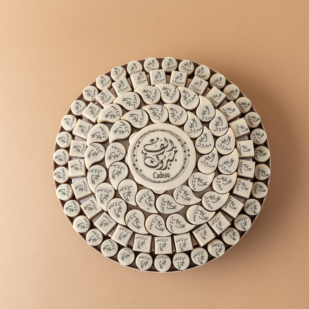 صينية خشبية فاخرة مُرصّعة بشوكولاتة بلجيكية مختارة بعناية ومطبوعة بعبارة “ألف مبروك”، تتوسطها قطعة شوكولاتة كبيرة تحمل نفس التهنئة، لتكون هدية أنيقة تعبّر عن الفرح بالمناسبات السعيدة.