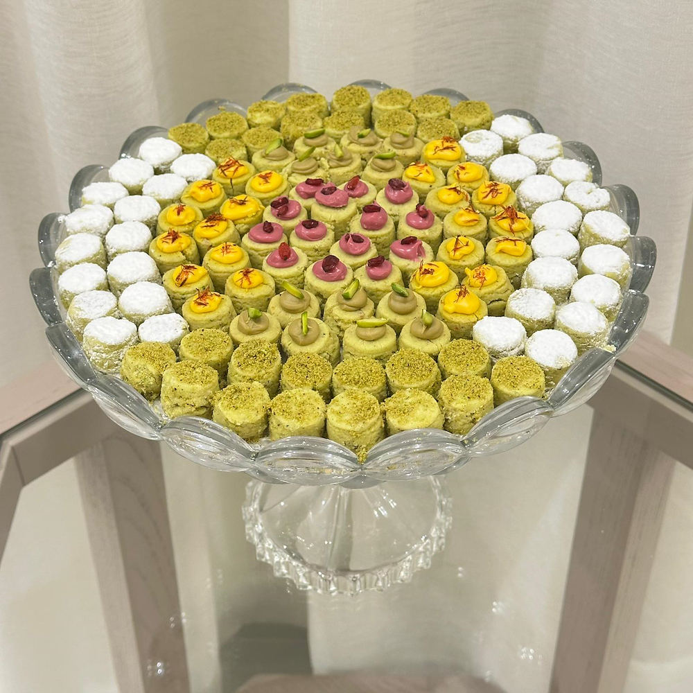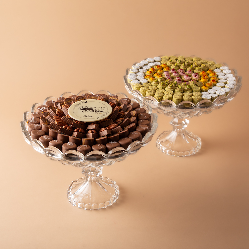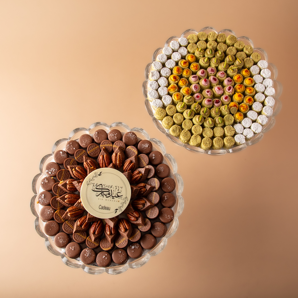 صينية كريستال راقية تحتوي على 0.880 كجم من الشوكولاتة البلجيكية الفاخرة بحشوات سالتد كراميل ، كيندر و بيكان و 0.650 كيلو غرام غريبة اسبيشل بنكهات مزينة بعبارة كاكاو مميزة: عيدكم مبارك.