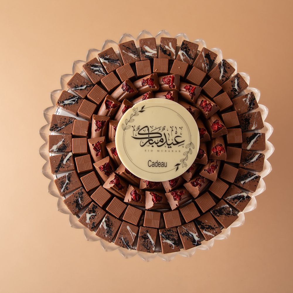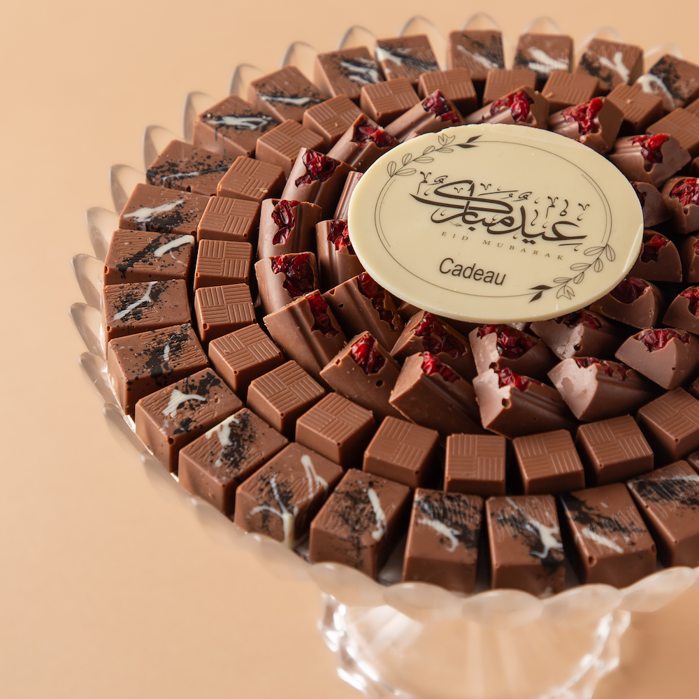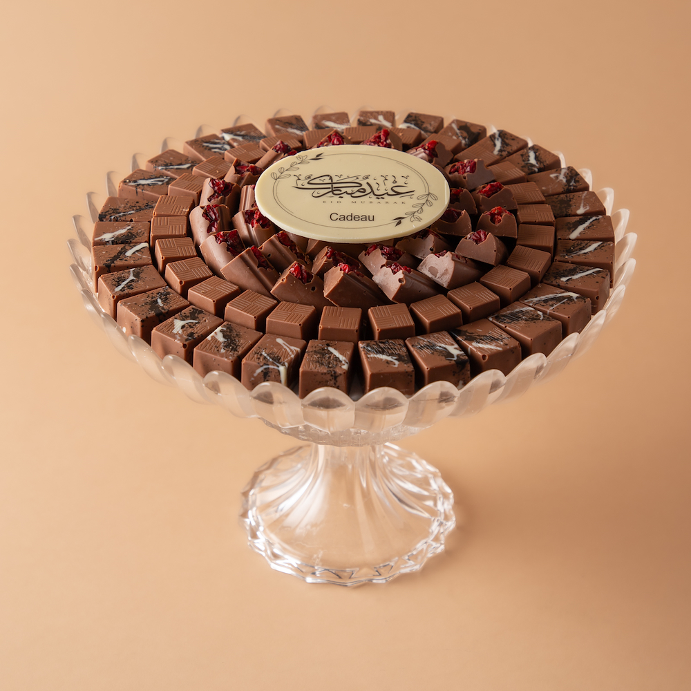 صينية كريستال راقية تحتوي على 0.775 كجم من الشوكولاتة البلجيكية الفاخرة بحشوات سالتد كراميل لوتس، وروشيه، ولوتس توت، ومزينة بعبارة كاكاو مميزة: عيدكم مبارك.