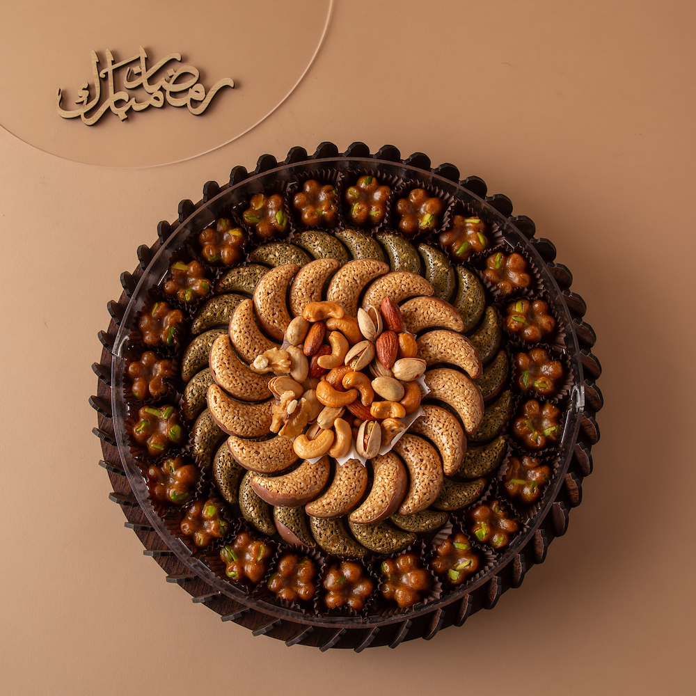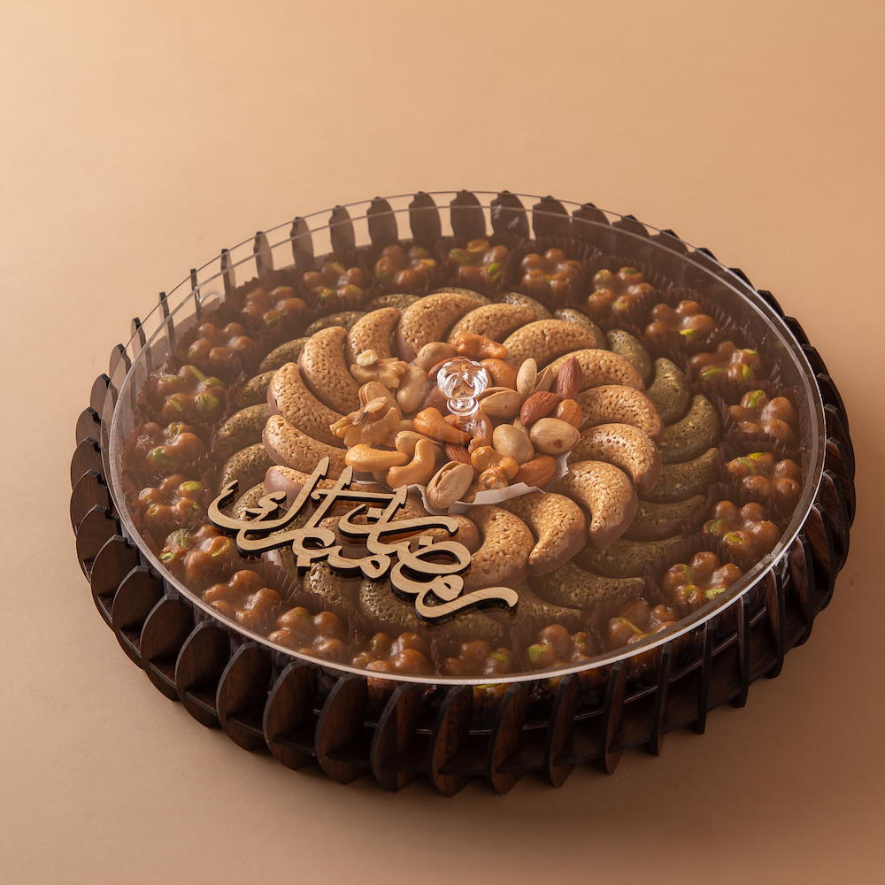 صينية خشب من تصاميمنا المميزة تحمل عبارة رمضان مبارك، تحتوي على تمر بالفستق، شوكولاتة السمسم، شوكولاتة الزعتر، ومكسرات مختارة.