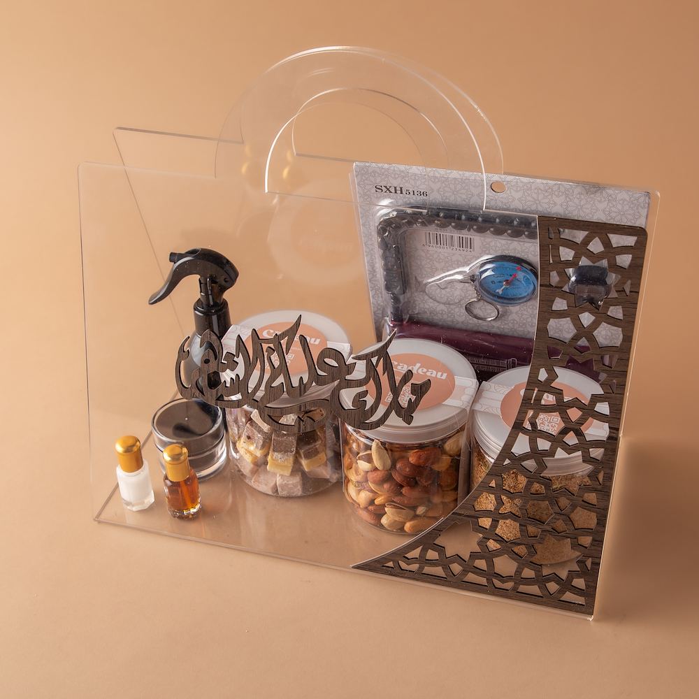 نقصة رمضانية من الأكريليك مزينة بعبارة “مبارك عليكم الشهر”، تجمع بين الذوق الراقي والروح الرمضانية، لتكون هدية أنيقة تليق بالشهر الكريم. المحتويات: جرة شوكولاتة رمضانية، جرة قهوة عربية، جرة مكسرات، مرش عطري، دهن عود، مسك، معمول ملكي، وهدية رمضانية.