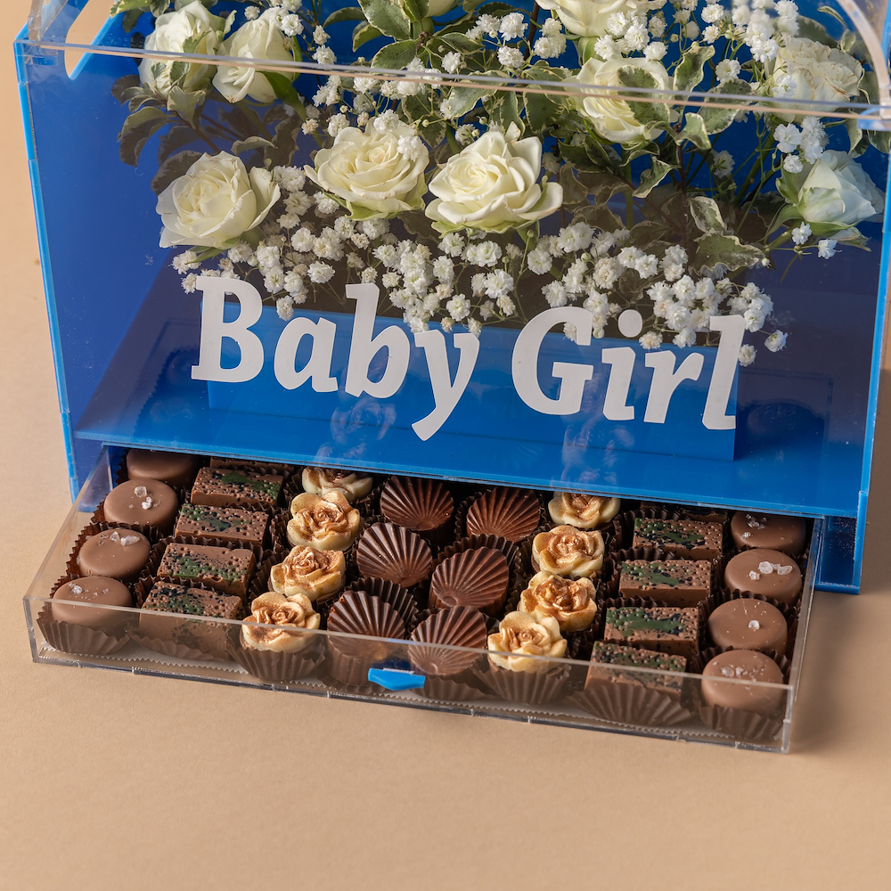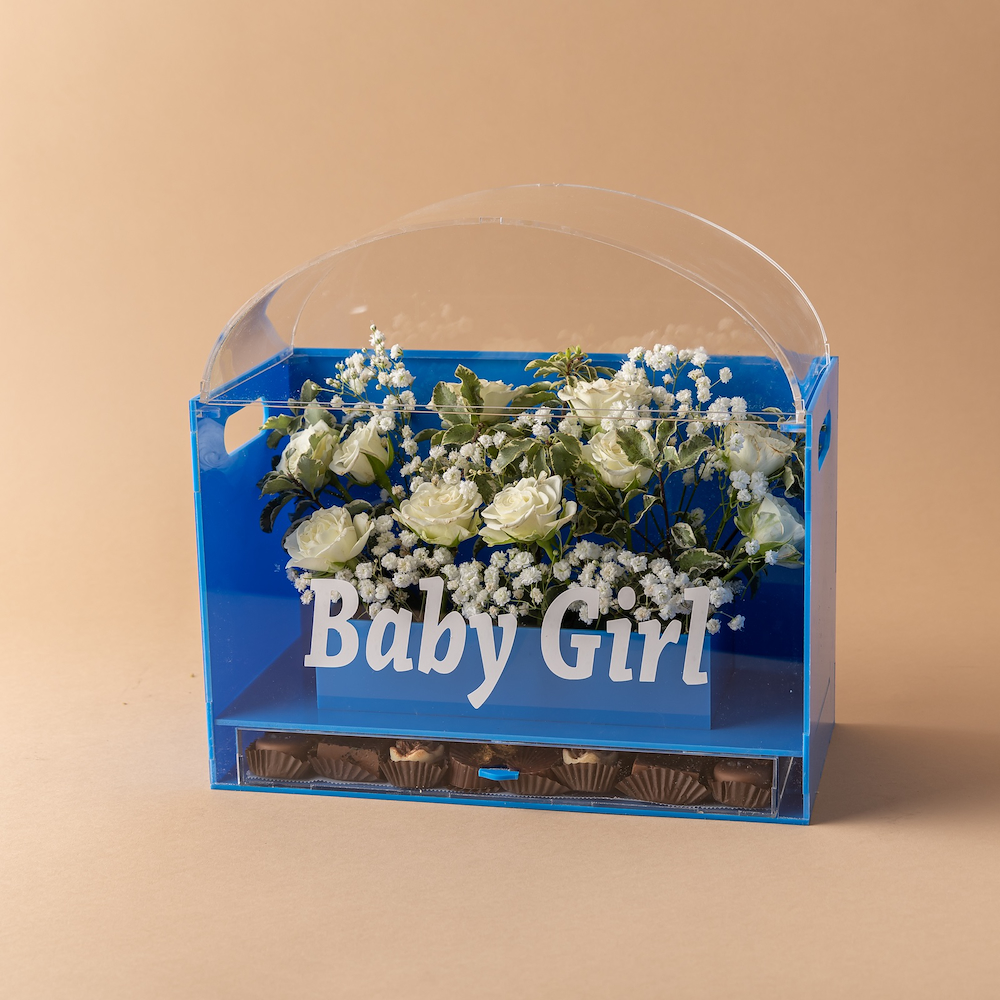 بوكس أكريليك أنيق باللون الأزرق مزين بالأزهار والشوكولاتة الفاخرة مع توبر خشبي أنيق، هدية مميزة للاحتفال بقدوم أمير صغير.