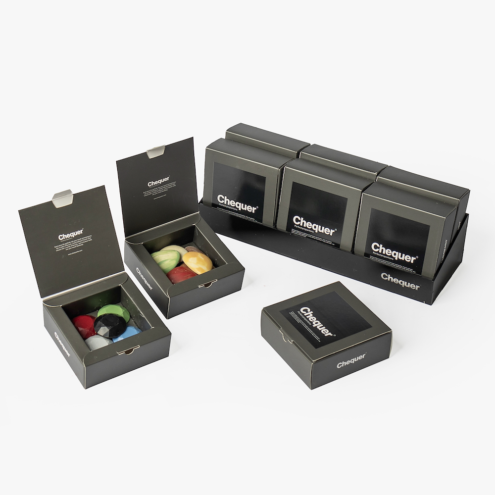 صينية من الأكريليك تحتوي على 6 علب من الشوكولاتة للتوزيعات.