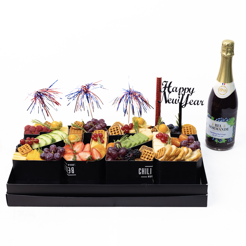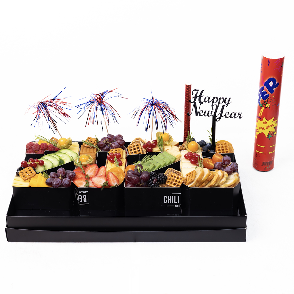 يحتوي هذا التنسيق على مجموعة مختارة من الجبن (شيدر أصفر، بري، كمون وشيدر أبيض) مع العنب، الزيتون، التوت، البسكويت، المكسرات، الفواكه المجففة، الفراولة، الخضروات وتغريسة للسنة الجديدة مع شمعة.