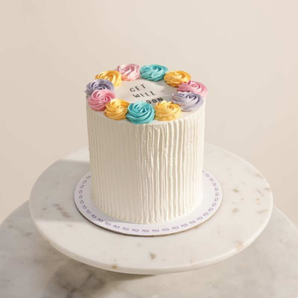 كيكة بتصميم زهوري مع كتابة الشفاء العاجل متوفرة بنكهات الشوكولاتة والفانيلا والمكس.