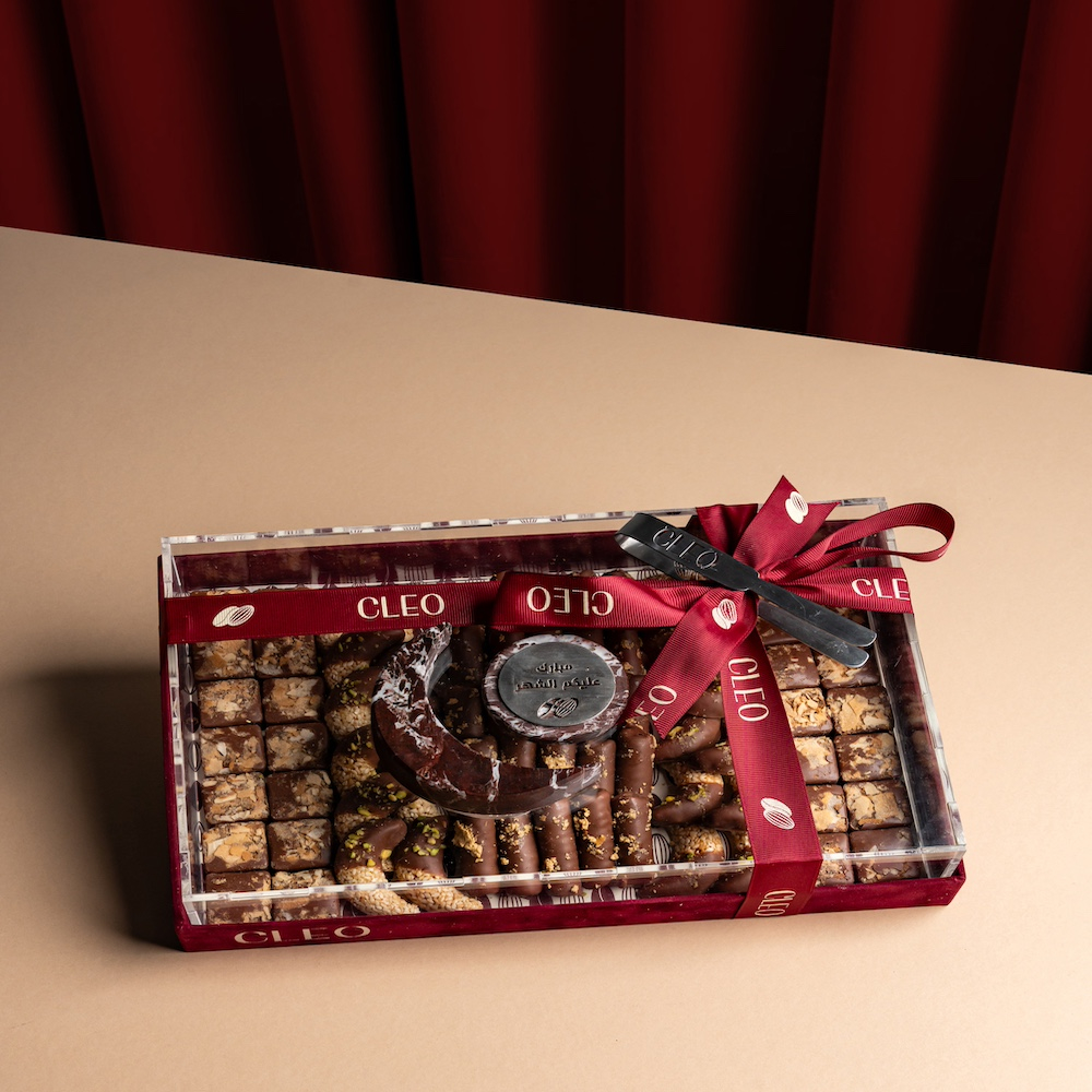 علبة مخملية فاخرة بمقبض هلالي رخامي، تحتوي على 700 جرام من الحلويات الكويتية المتنوعة، بما في ذلك ويفر الشوكولاتة بالرهش، الشوكولاتة بالفستق والسمسمية، وشوكولاتة الدرابيل المقرمشة.