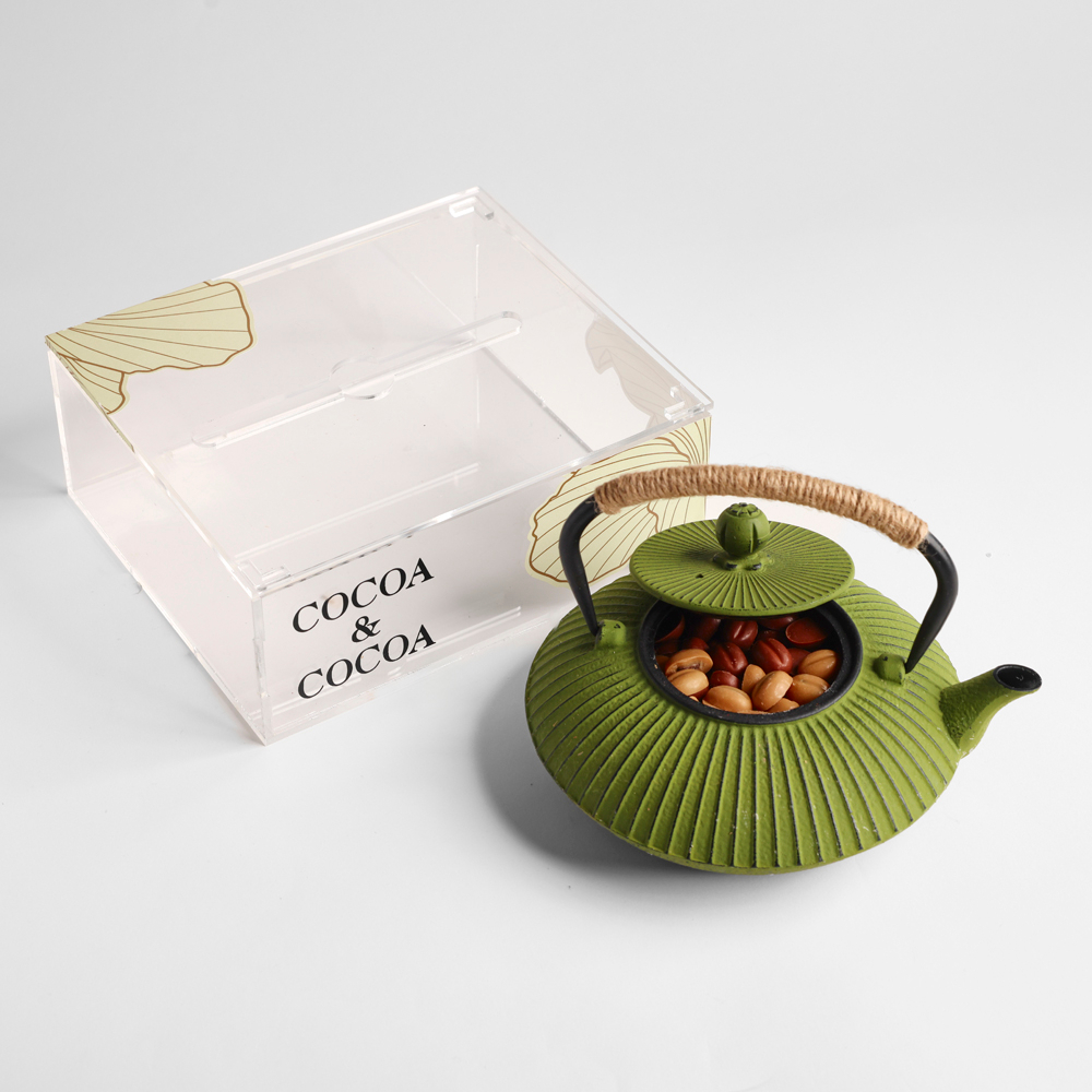 صينية على شكل إبريق شاي تحتوي على 250 جرام من الشوكولاتة بحشوات الرهش والكاكاو إسبريسو.