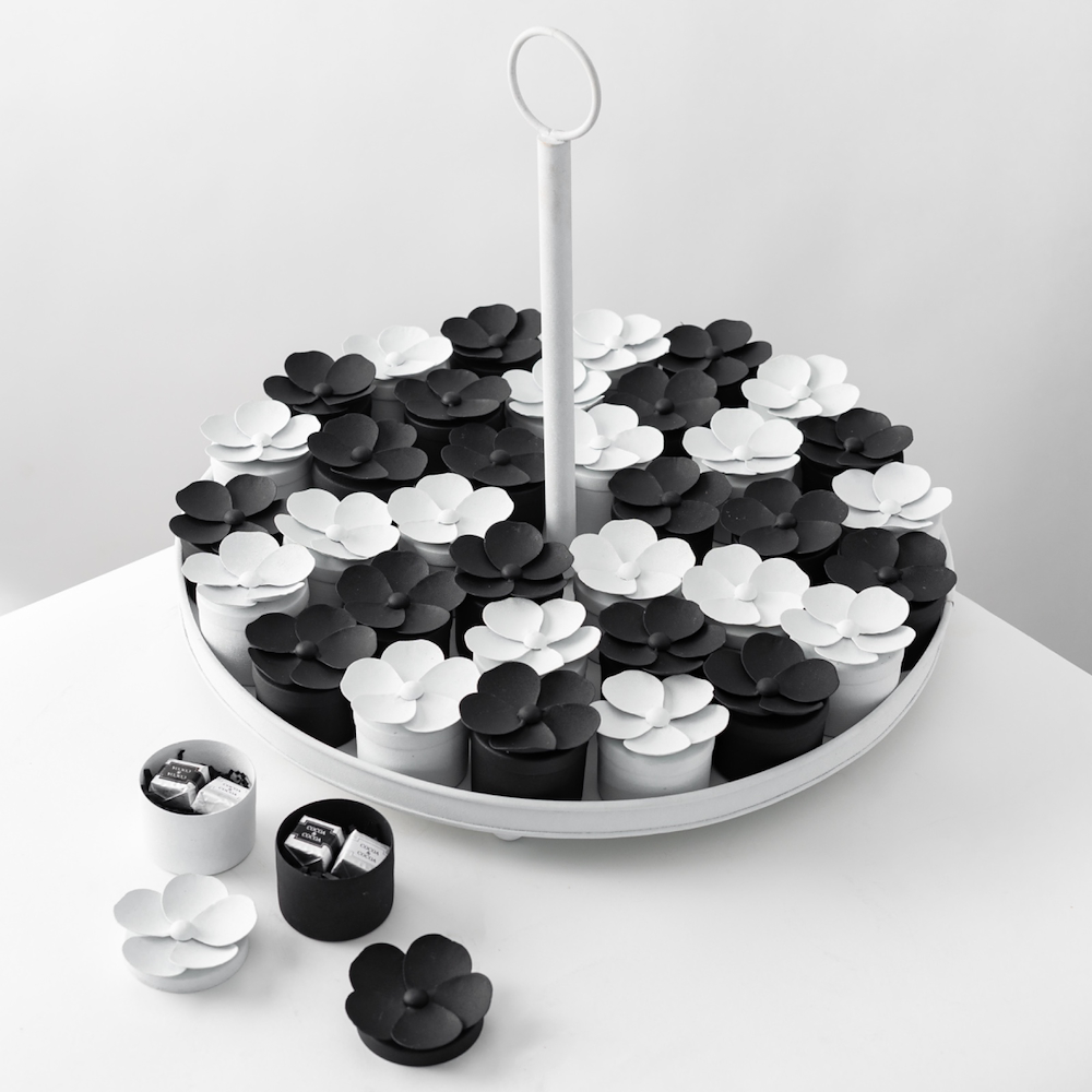 هذه الصينية تحتوي على 35 علبة صغيرة مع الشوكولاتة المغلفة داخل كل علبة.