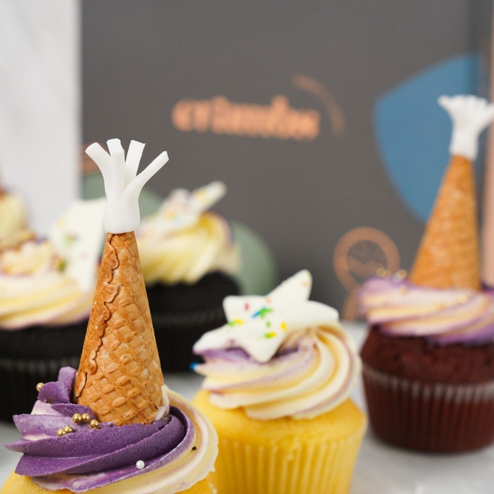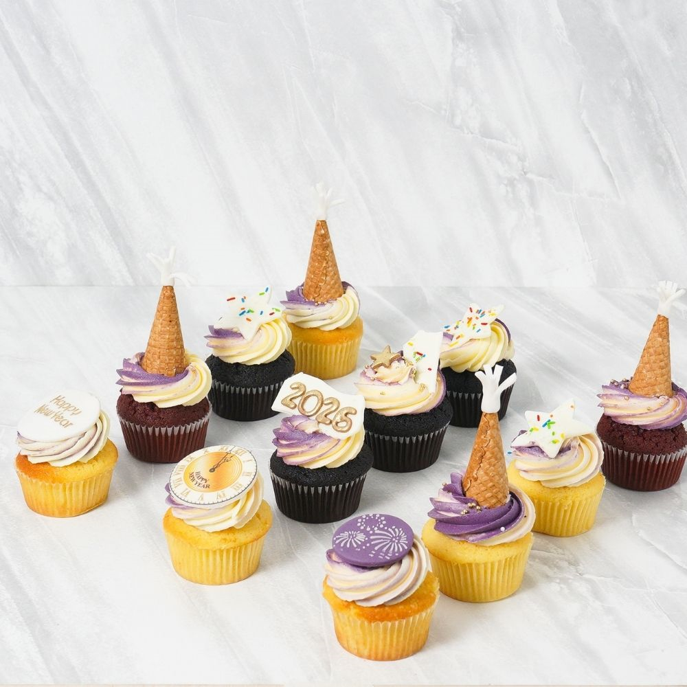 أفضل كب كيك من كرمز بنكهات الشوكولاتة، الفانيلا والرد فيلفت، مزينة بشكل جميل للإحتفال بالعام الجديد 2026. حلويات مثالية لبدء الإحتفالات بحلاوة لذيذة وتصاميم إحتفالية. يقدم في بوكس كرمز.