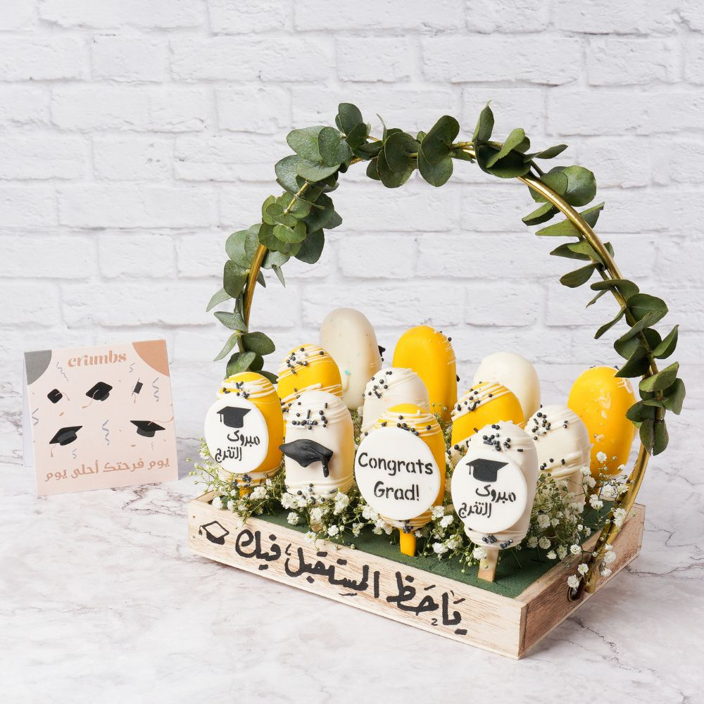 12 قطعة من أعواد الكيك مزينة لحفل التخرج. كل قطعة كيك مغلفة بشكل فردي للحفاظ على نضارتها وجمالها.