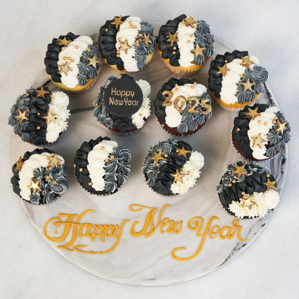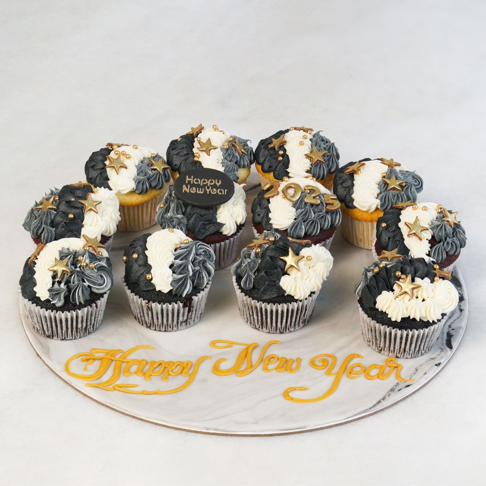 12 كب كيك بنكهات الشوكولاتة، الفانيلا والرد فلفيت مزينة للإحتفال برأس السنة.