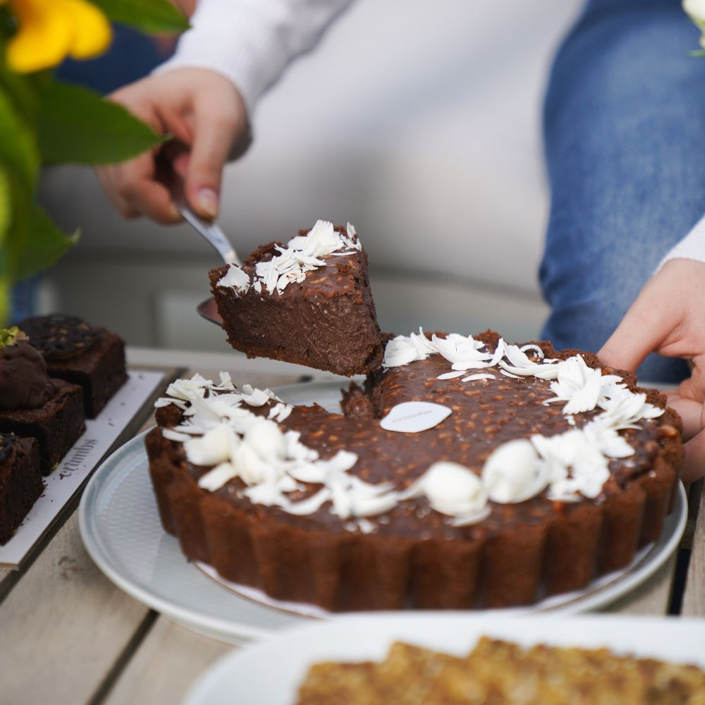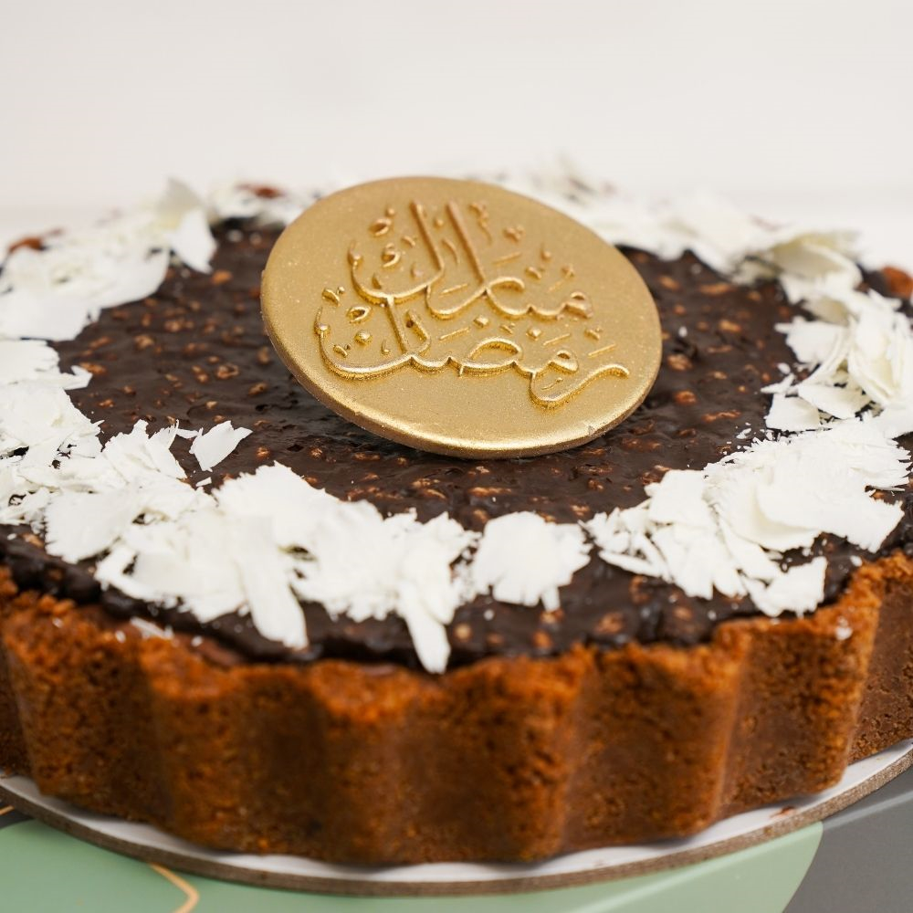 موس شوكولاتة فاخر في قشرة بسكويت مغطاة بجناش غني ومقرمش ورقائق شوكولاتة بيضاء. حلوى مثالية للإحتفالات الخاصة مناسبة من 6 إلى 7 أشخاص.