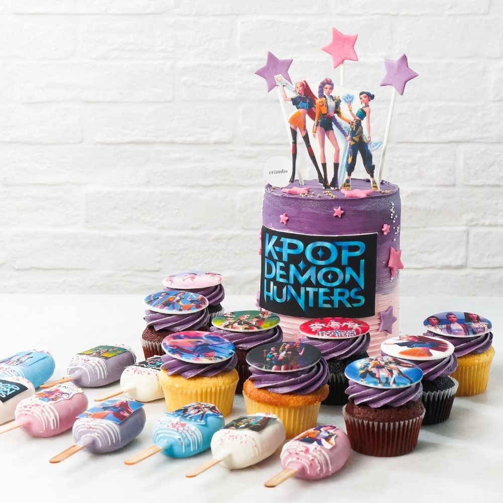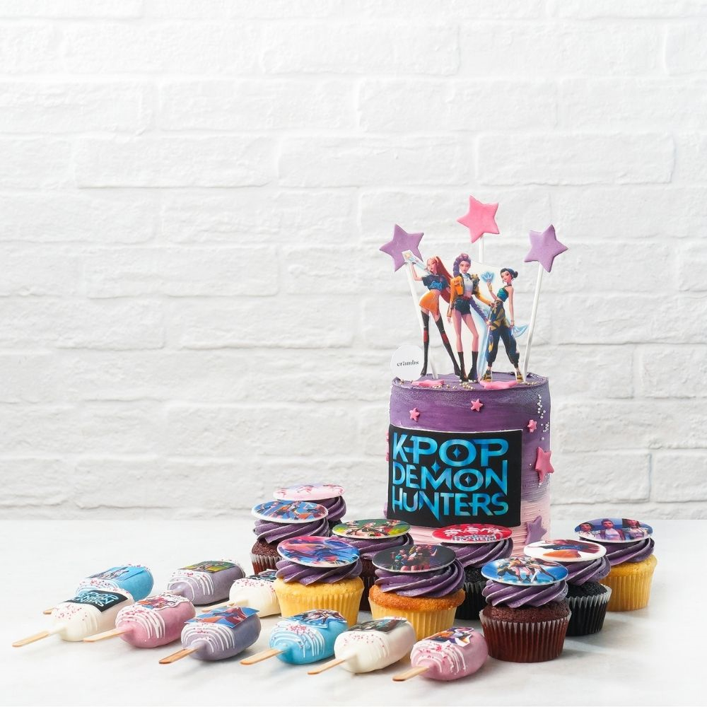 كيكة ممتعة بتصميم ديمون هنتر تكفي من 6 إلى 8 أشخاص، مع 9 كيكسكلز و 9 كب كيك بمزيج من النكهات، تكفي المجموعة الكاملة من 22 إلى 26 طفلًا.