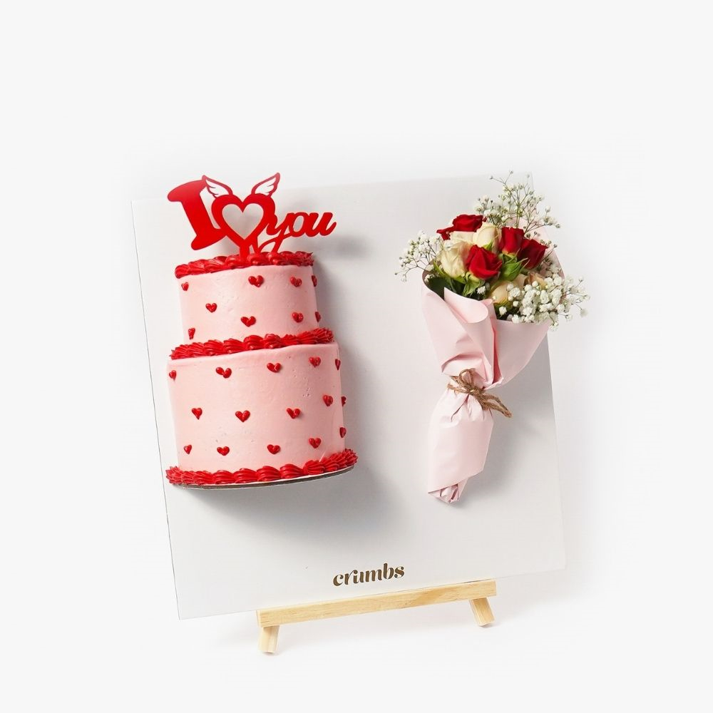 كيكة فنية رائعة من الشوكولاتة والريد فيلفت تكفي من 3 إلى 4 أشخاص. تقدم مع باقة زهور صغيرة.