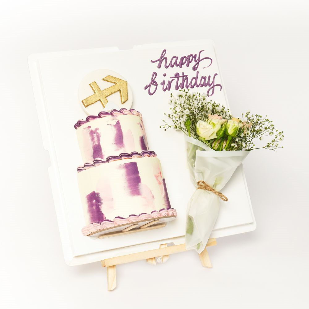 كيكة ممتعة بنكهات الشوكولاتة والريد فيلفت، تكفي من 3 إلى 4 أشخاص، تُقدّم مع باقة زهور صغيرة.