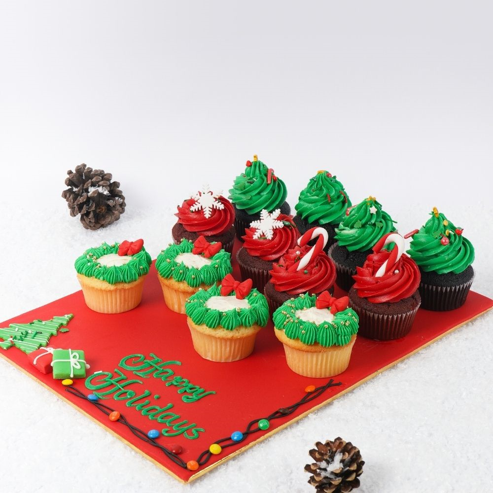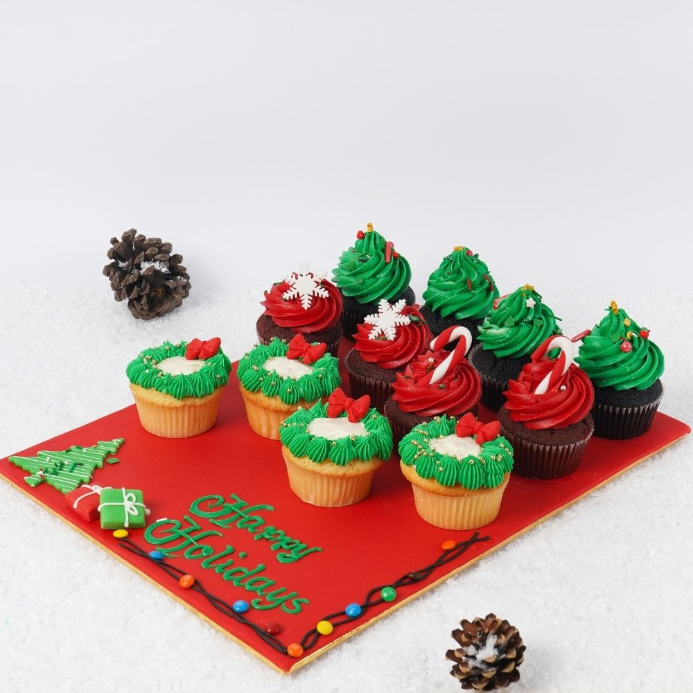 صينية تحتوي على 12 كب كيك بالشوكولاتة والفانيلا والرد فيلفت بلمسات الشتاء الأنيقة.