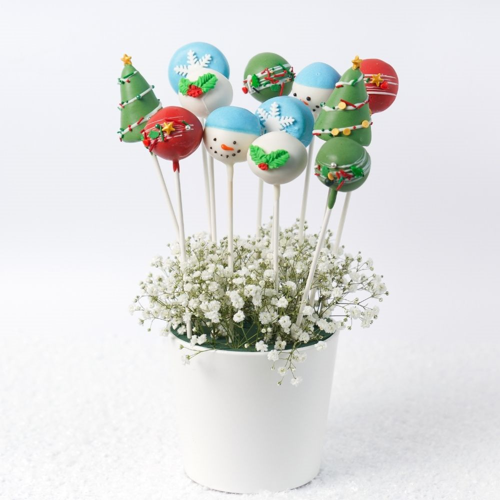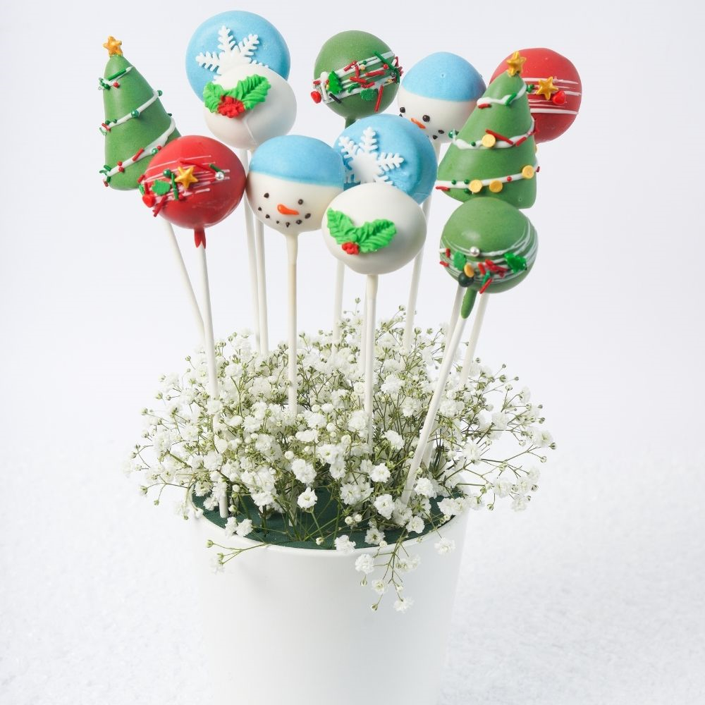 فازة أنيقة تحتوي على 12 كيك بوب مزينة بأزهار.
