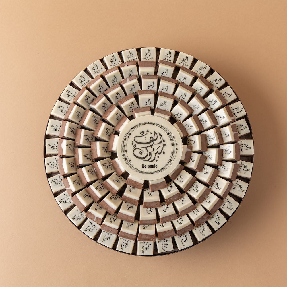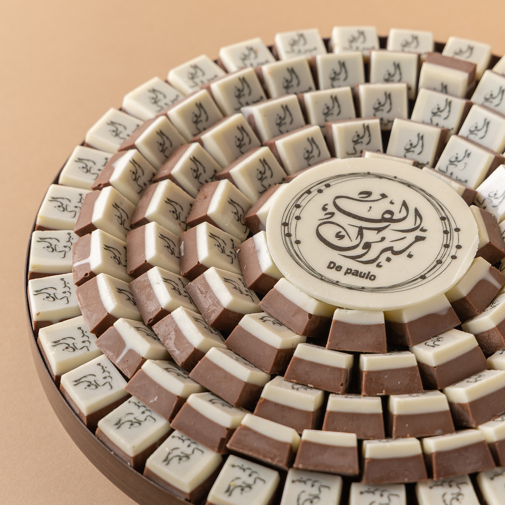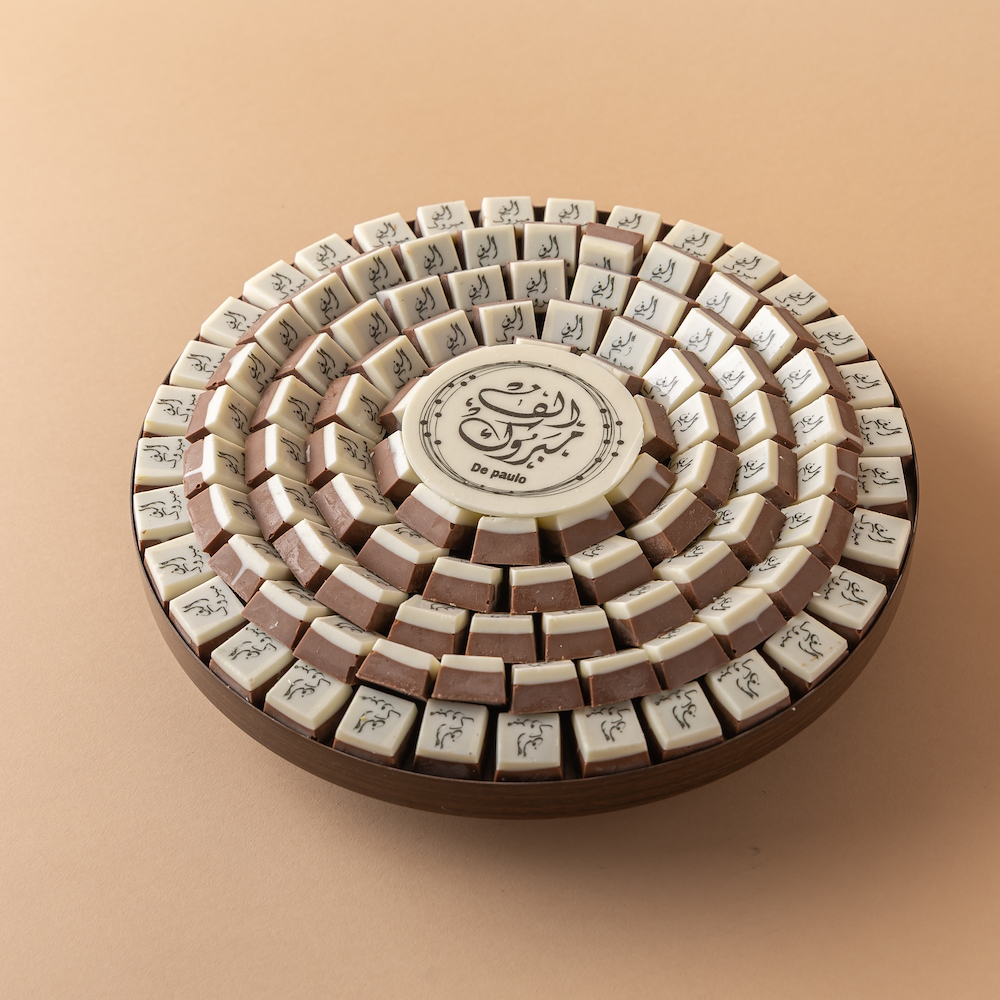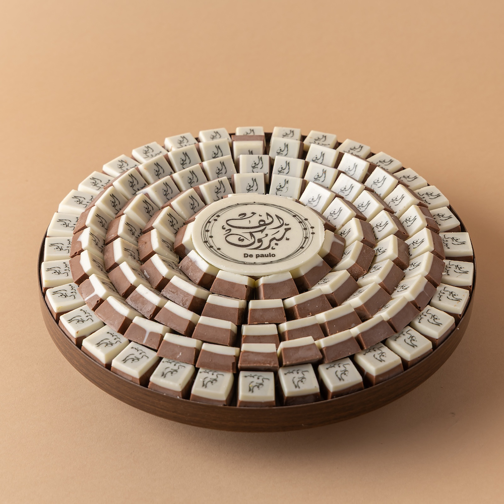 صينية خشبية فاخرة مُرصّعة بشوكولاتة بلجيكية مختارة بعناية ومطبوعة بعبارة “ألف مبروك”، تتوسطها قطعة شوكولاتة كبيرة تحمل نفس التهنئة، لتكون هدية أنيقة تعبّر عن الفرح بالمناسبات السعيدة.