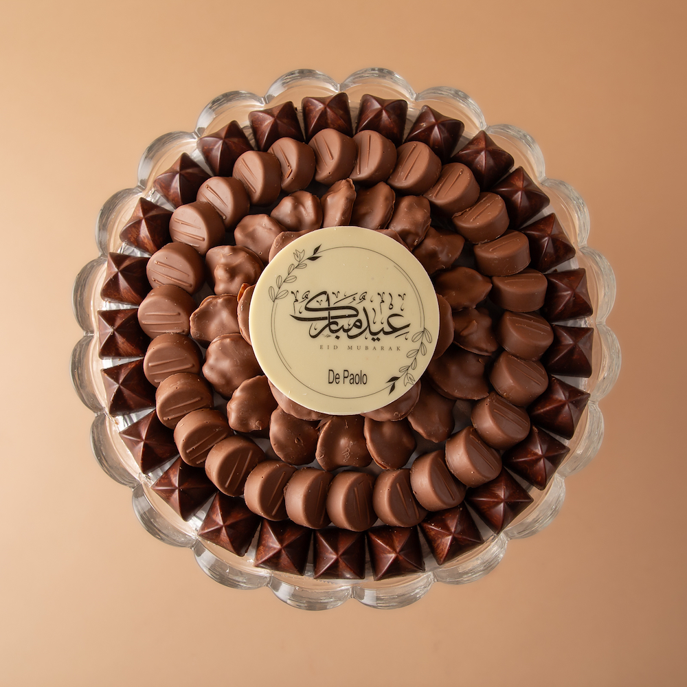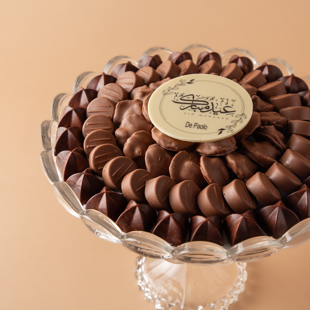 صينية كريستال راقية تحتوي على 0.880 كجم من الشوكولاتة البلجيكية الفاخرة بحشوات النوتيلا ويفر، البيكان، والفستق، مزينة بعبارة كاكاو مميزة: عيدكم مبارك.