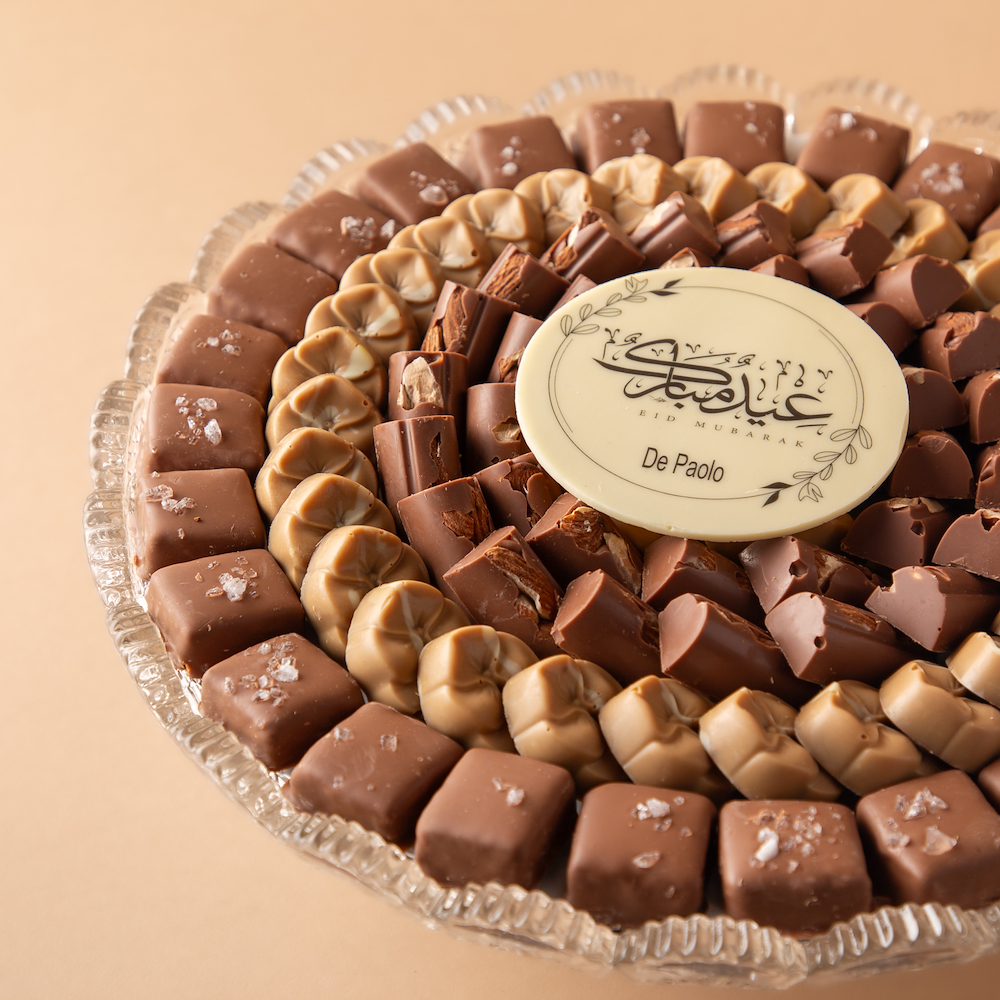 صينية كريستال راقية تحتوي على 0.900 كجم من الشوكولاتة البلجيكية الفاخرة بحشوات لوز كراميل ، هيل كراميل و سالتد كرانشي، مزينة بعبارة كاكاو مميزة: عيدكم مبارك.