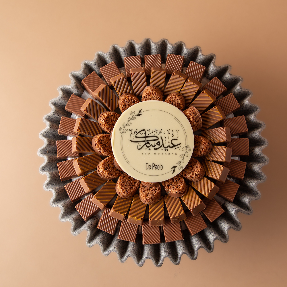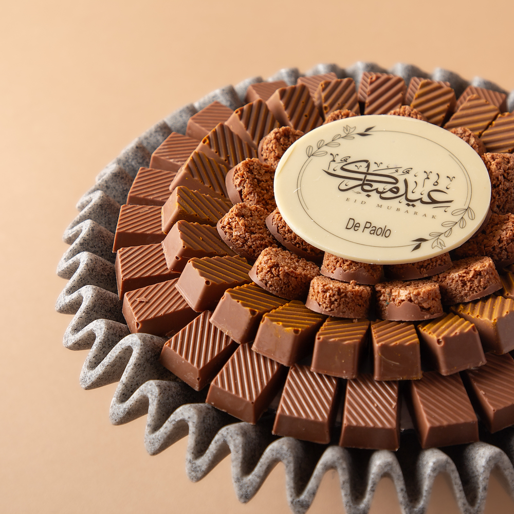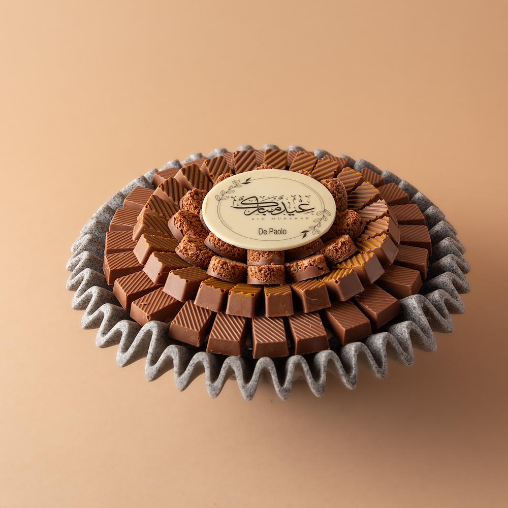 صينية فاخرة مصنوعة من الرزين، تحتوي على مزيج من الشوكولاتة الفاخرة بحشوة المرجان بالمكسرات، التشيزكيك، والتشوكو كرانش.