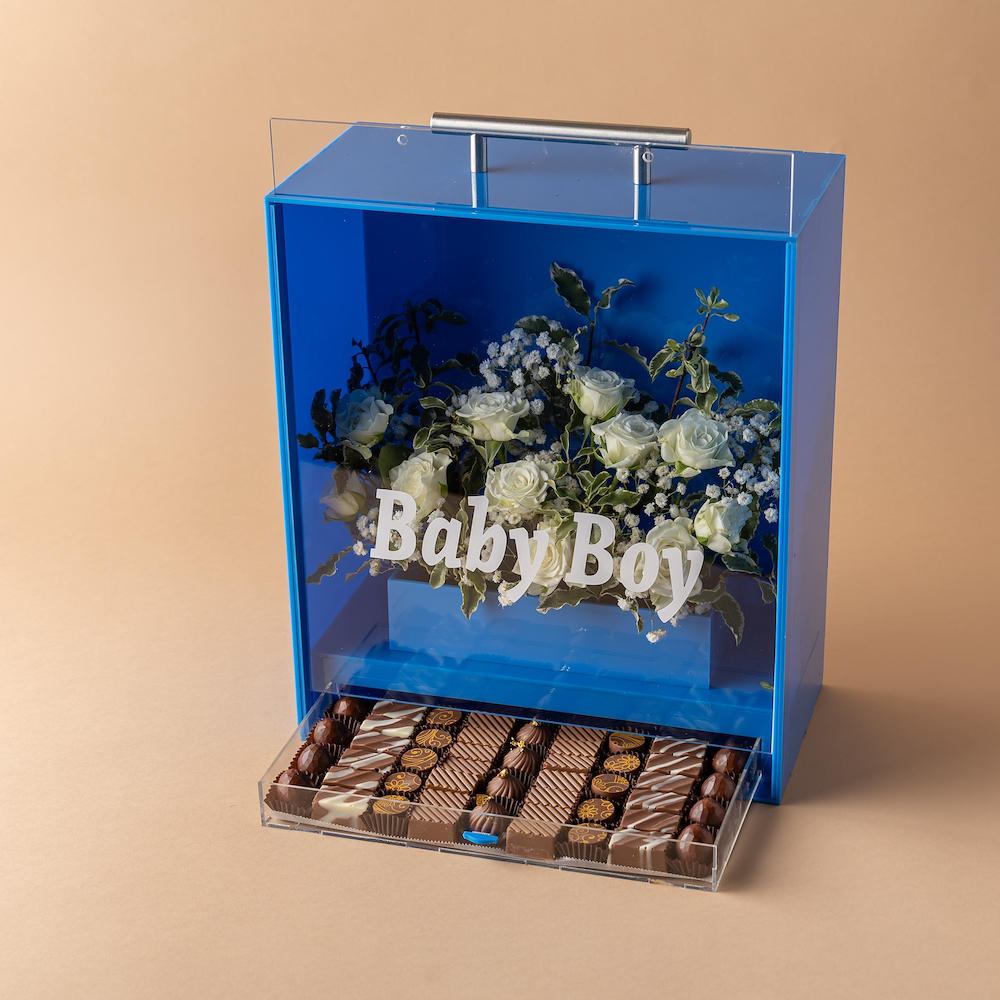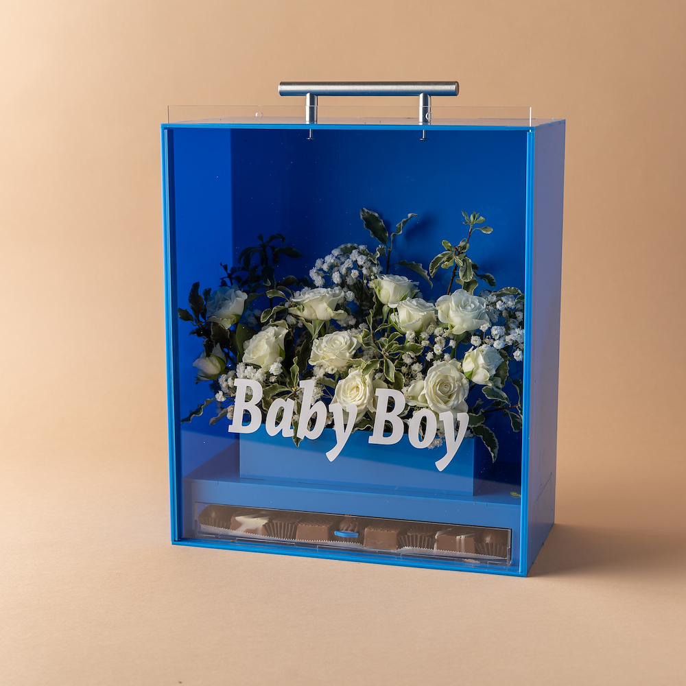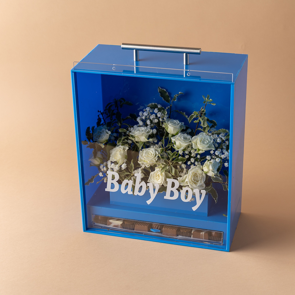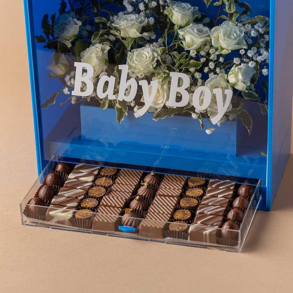 بوكس أكريليك فاخر من تصاميمنا المميزة، مزين بالزهور الطبيعية البيضاء بلمسة أنيقة، يحمل عبارة “Baby Boy” ويضم تشكيلة من الشوكولاتة الفاخرة، ليكون هدية مثالية للاحتفال بقدوم المولود الجديد.