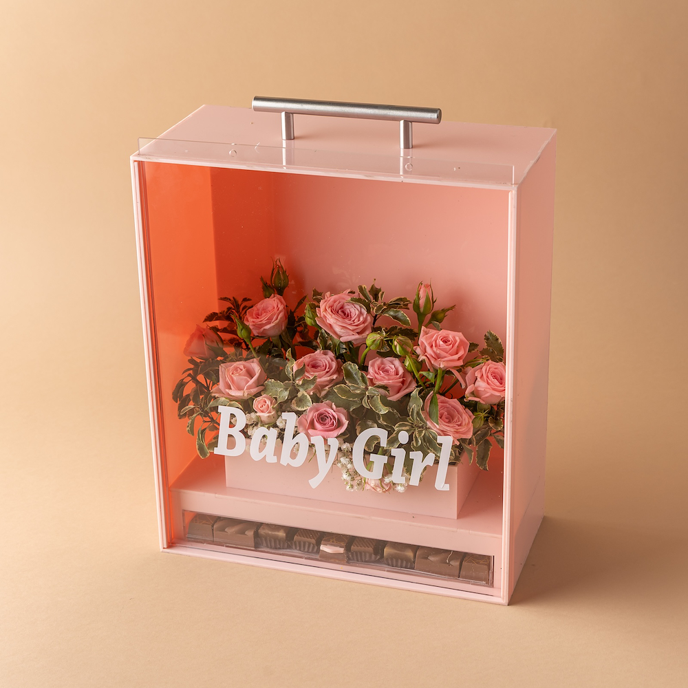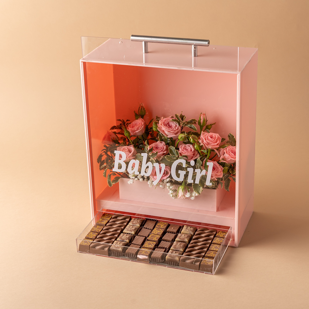 بوكس أكريليك فاخر من تصاميمنا المميزة، مزين بالزهور الطبيعية الوردية بلمسة أنيقة، يحمل عبارة “Baby Girl” ويضم تشكيلة من الشوكولاتة الفاخرة، ليكون هدية مثالية للاحتفال بقدوم المولودة الجديدة.