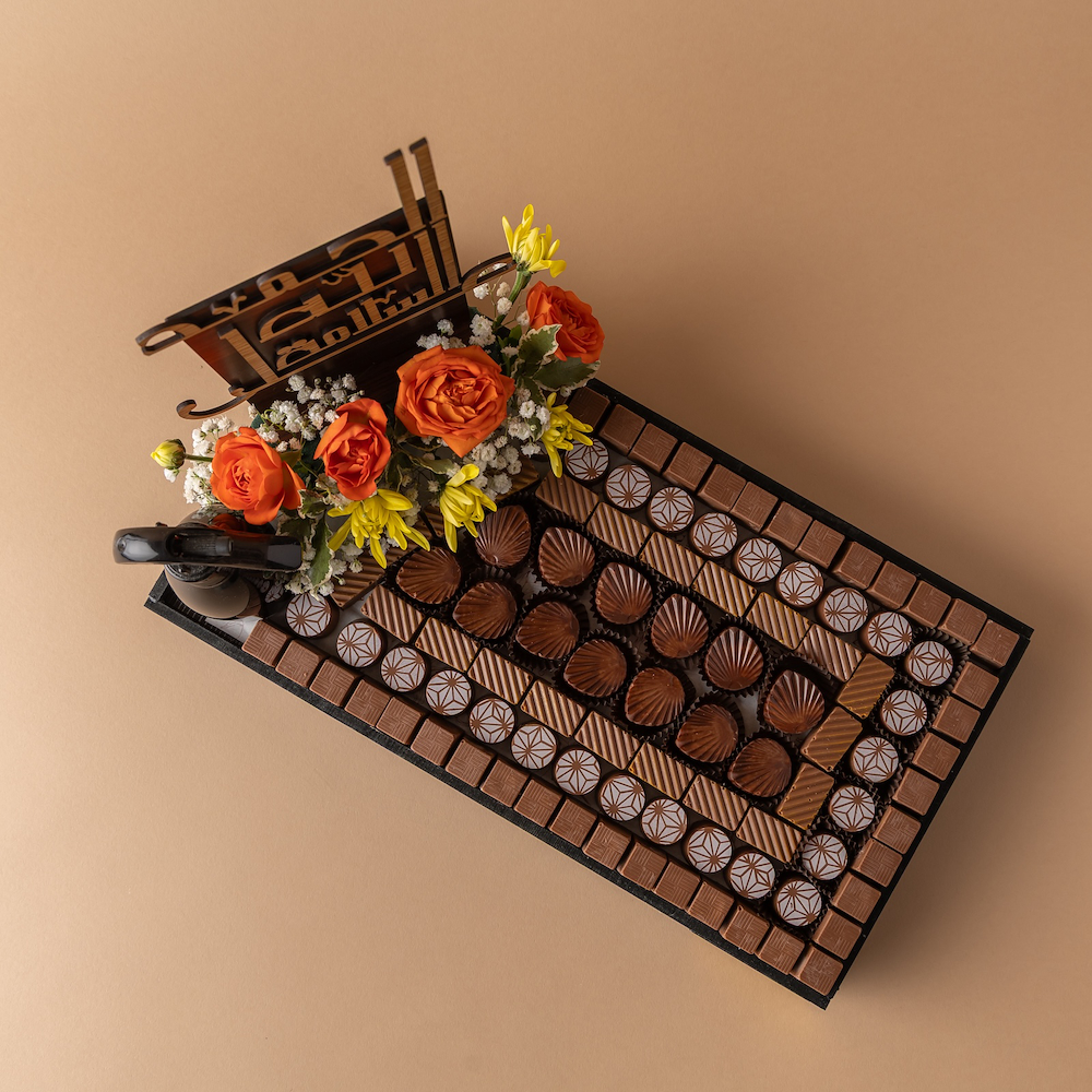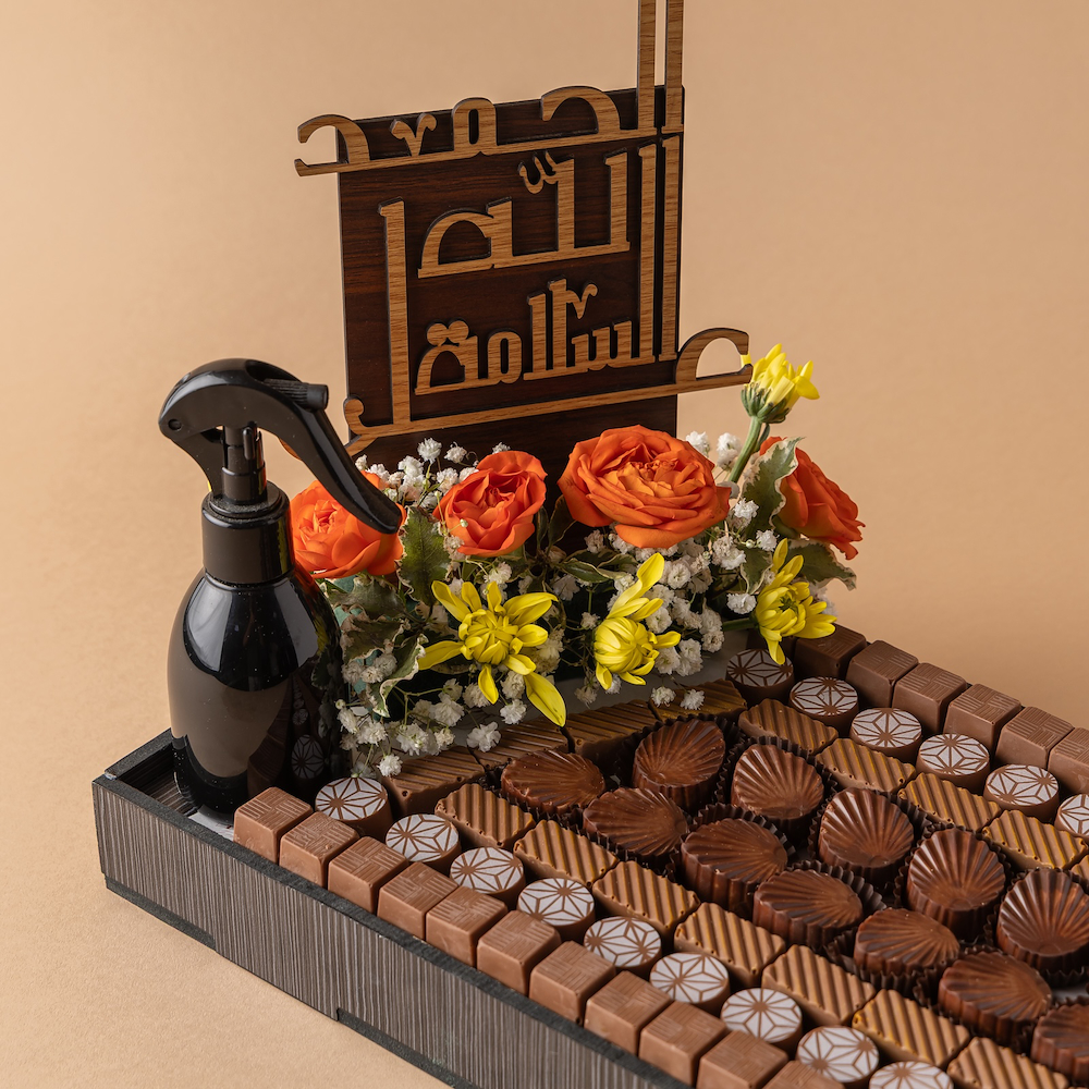 صينية خشب راقية مزينة بالزهور الطبيعية وتضم تشكيلة من الشوكولاتة الفاخرة، مرفقة بمرش عطر الدورا المميز وعبارة خشبية “الحمدلله على السلامة”، لتكون هدية تعبّر عن الاهتمام والفرحة بسلامة الأحبة بأسلوب أنيق ومميز.