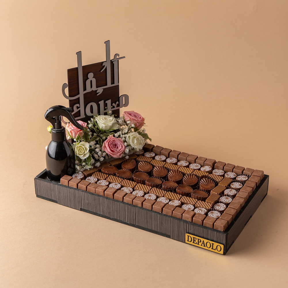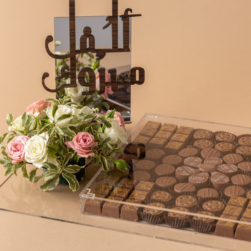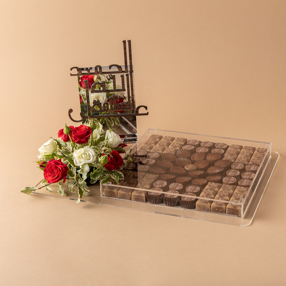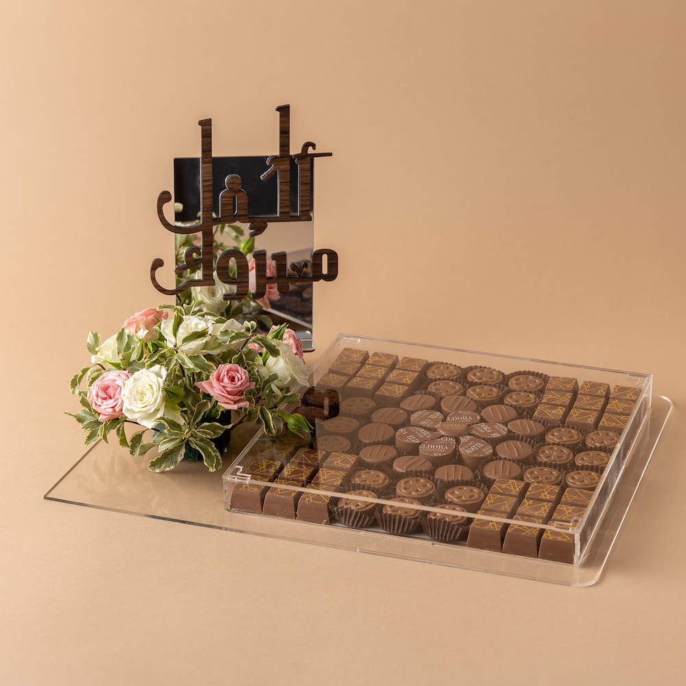 بوكس أكريليك راقٍ مزين بالزهور الطبيعية ويضم تشكيلة من الشوكولاتة الفاخرة، تتوسطه عبارة خشبية “ألف مبروك”، ليكون هدية فاخرة تعبّر عن الفرح والتهنئة بكل مناسبة سعيدة بلمسة أنيقة ومميزة.
