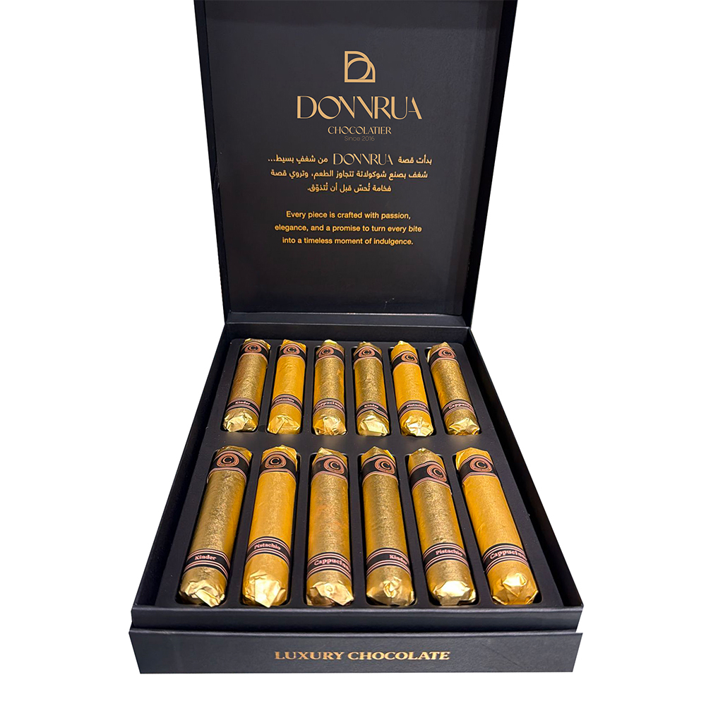 علبة هدايا فاخرة تحتوي على حلوى الشوكولاتة اللذيذة بما في ذلك أصناف الفستق والكابتشينو والكندر مقدمة في حاوية أنيقة على شكل سيجار مع بطاقة مثالية لاحتفالات العيد والمناسبات الخاصة.