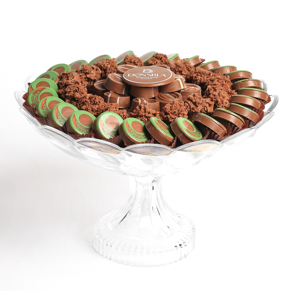 صينية كريستال تحتوي على 1 كيلو من كنافة الفستق المقرمشة وبسكويت الهيل العطري للمناسبات الإحتفالية.