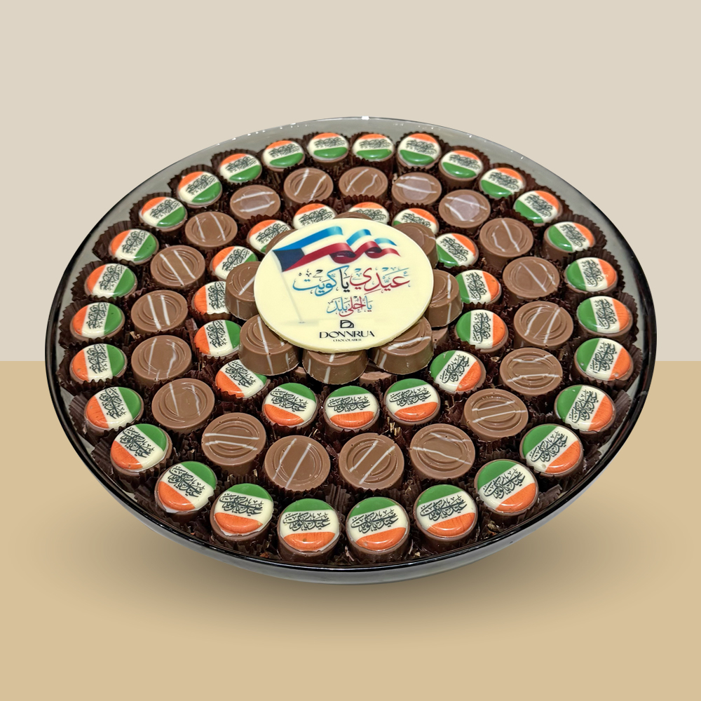 احتفل باليوم الوطني الكويتي مع صينية خاصة بنا تحتوي على كيلو واحد من الشوكولاتة الفاخرة مع 80 قطعة من الحلويات اللذيذة المثالية للمشاركة خلال الاحتفالات.