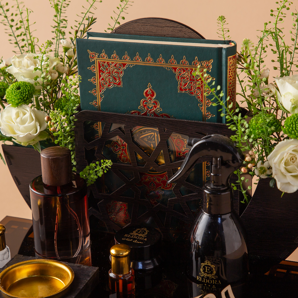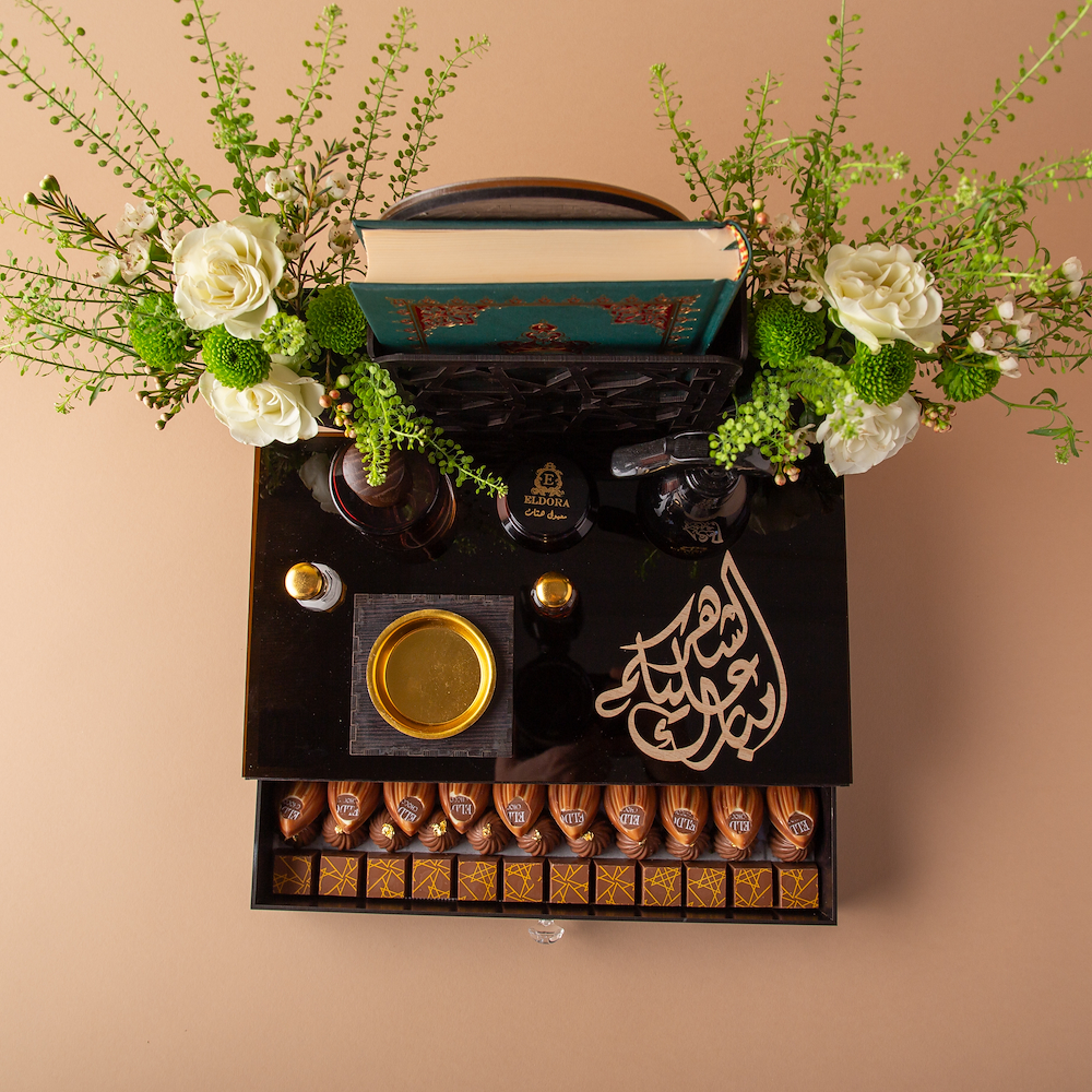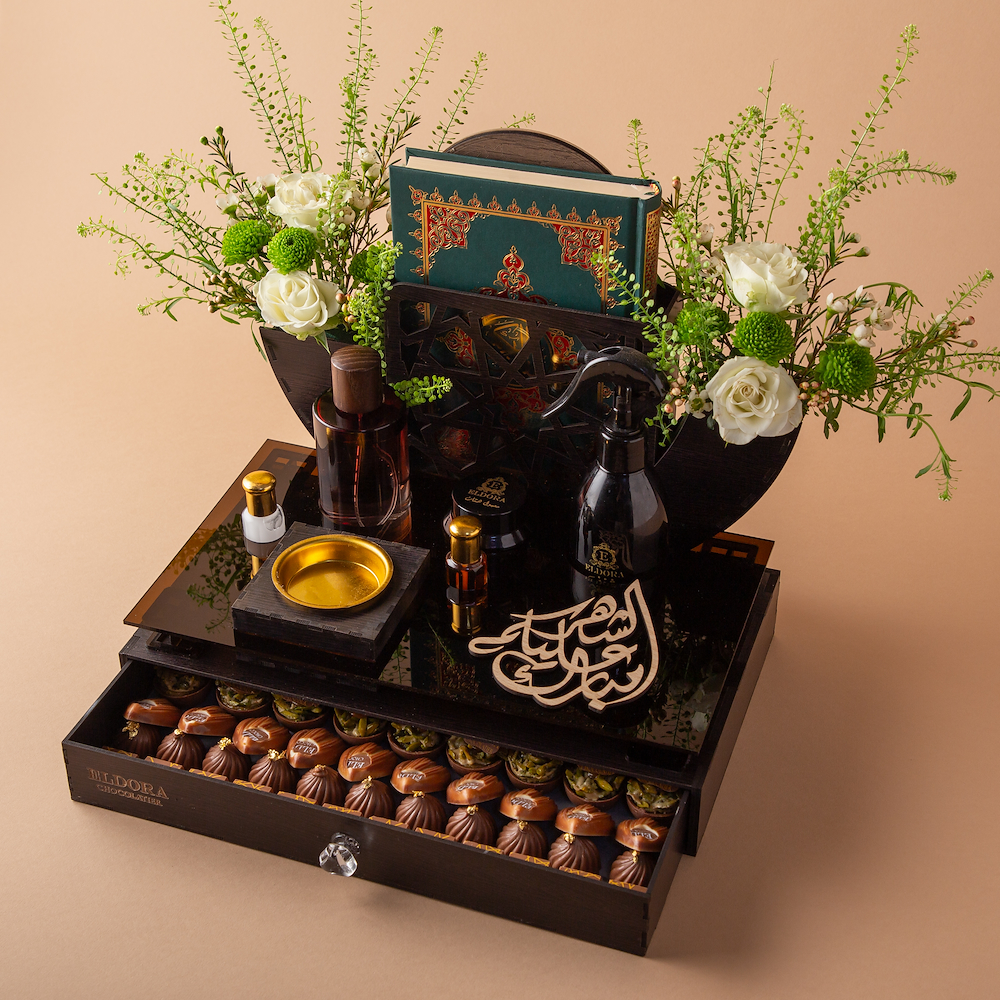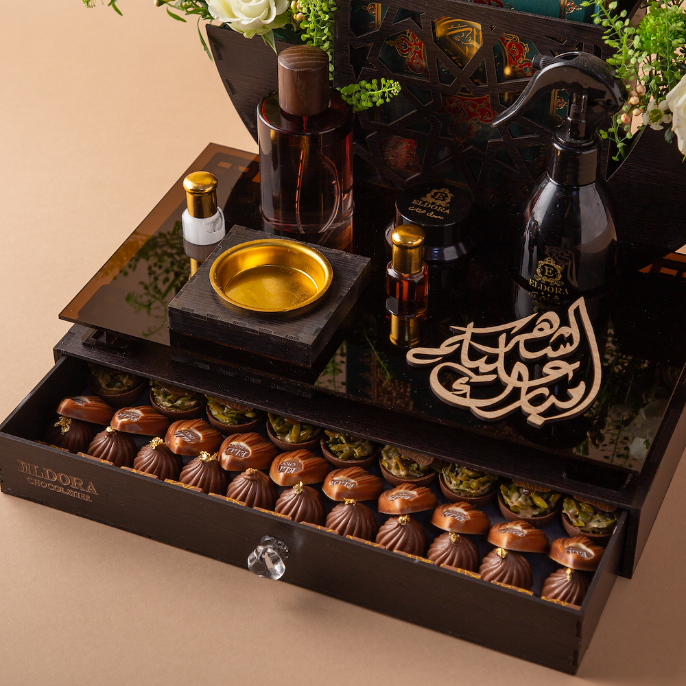 صندوق خشبي بتصميم راقي مزين بالزهور يحتوي على 0.750 كيلو من الشوكولاتة من اصنافنا المختارة، مرش الدورا، مسك، دهن عود، معمول، مبخر، مصحف، حامل مصحف وعطر الدورا المميز.