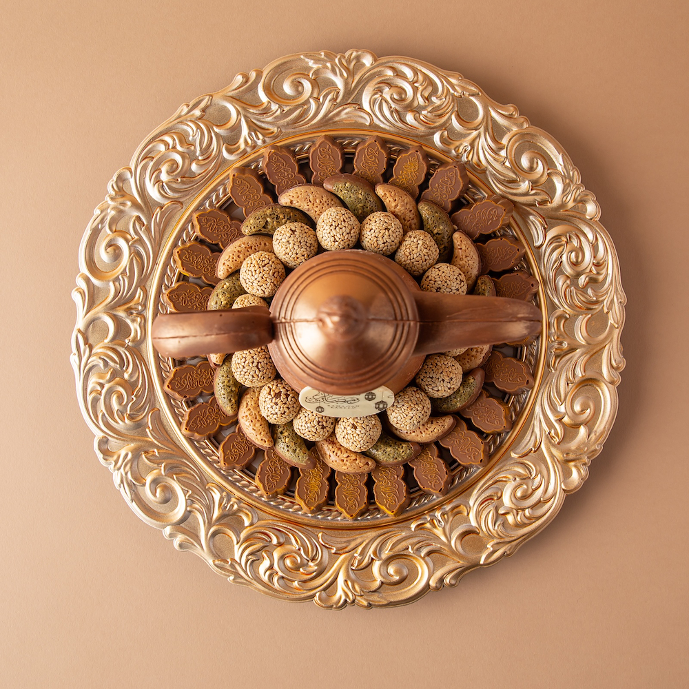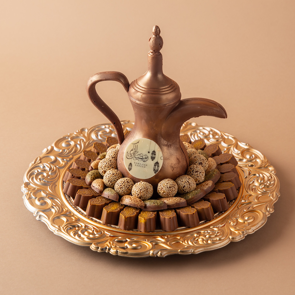 صينية ذهبية راقية، مزينة بدلة قهوة أنيقة، وتضم تشكيلة من الشوكولاتة الفاخرة بنكهات مستوحاة من أجواء شهر رمضان المبارك.