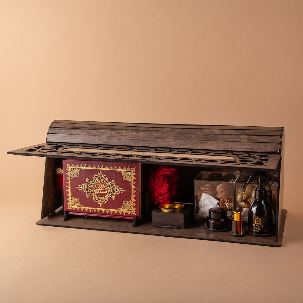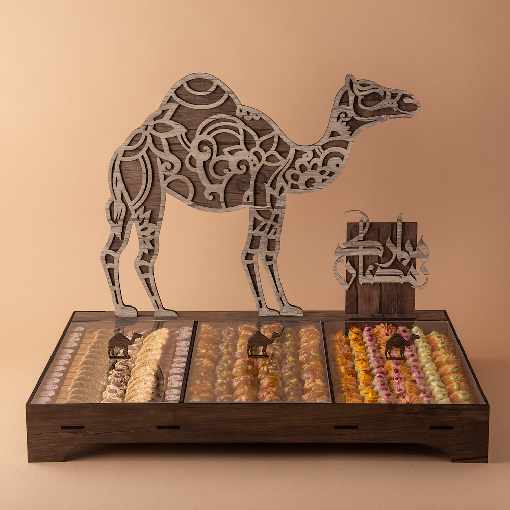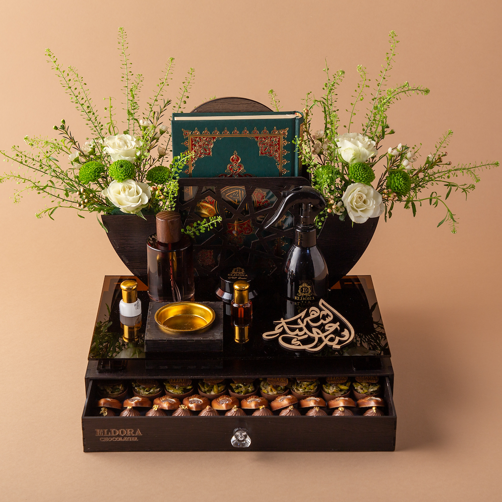 ستاند خشب وأكريليك من تصاميمنا الخاصة يحتوي على الشوكولاتة الفاخرة لمناسبة التخرج.