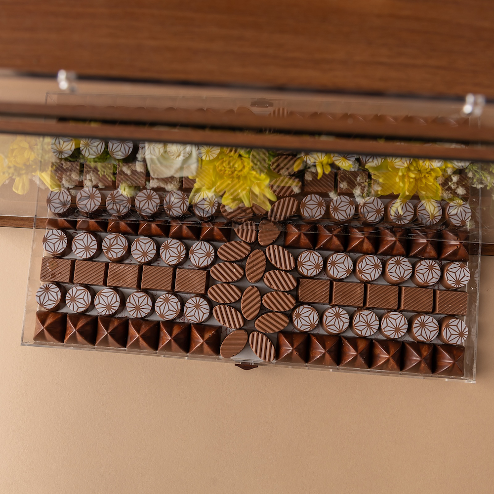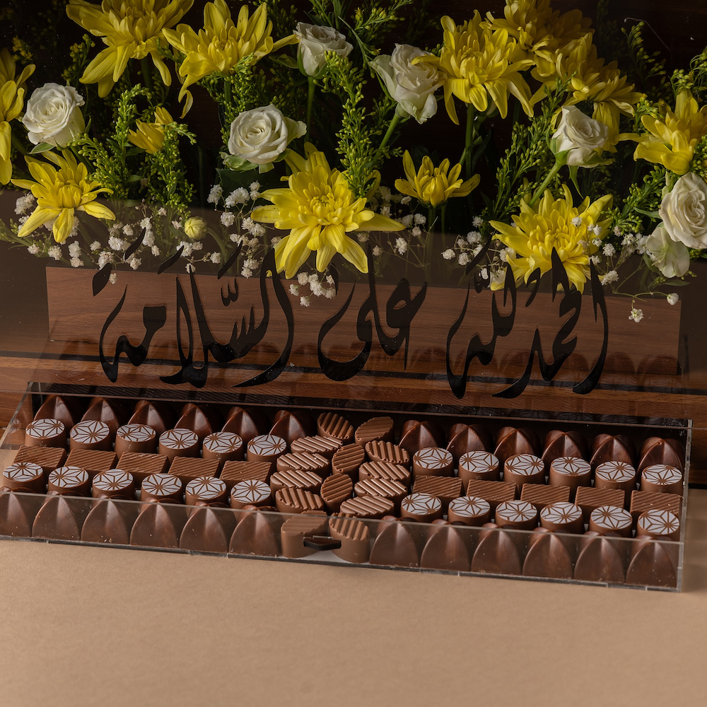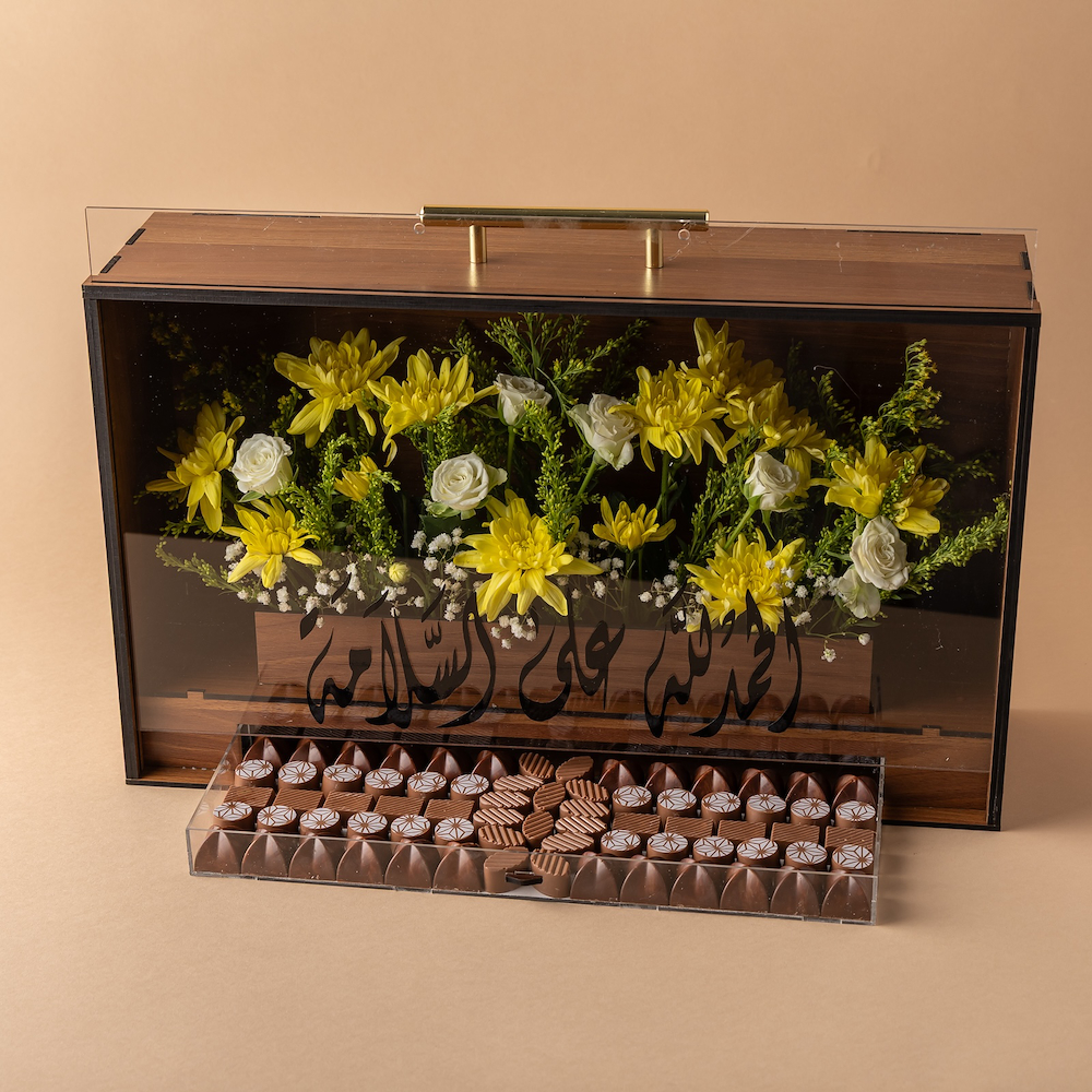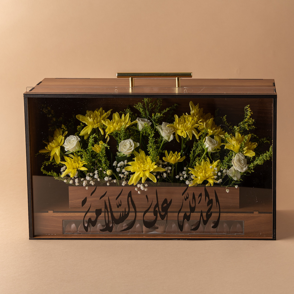 بوكس خشبي فاخر مزين بأزهار باللون الأصفر والأبيض مع شوكولاتة فاخرة، هدية أنيقة تعبّر عن الدفء والاهتمام والتمنيات الجميلة.
