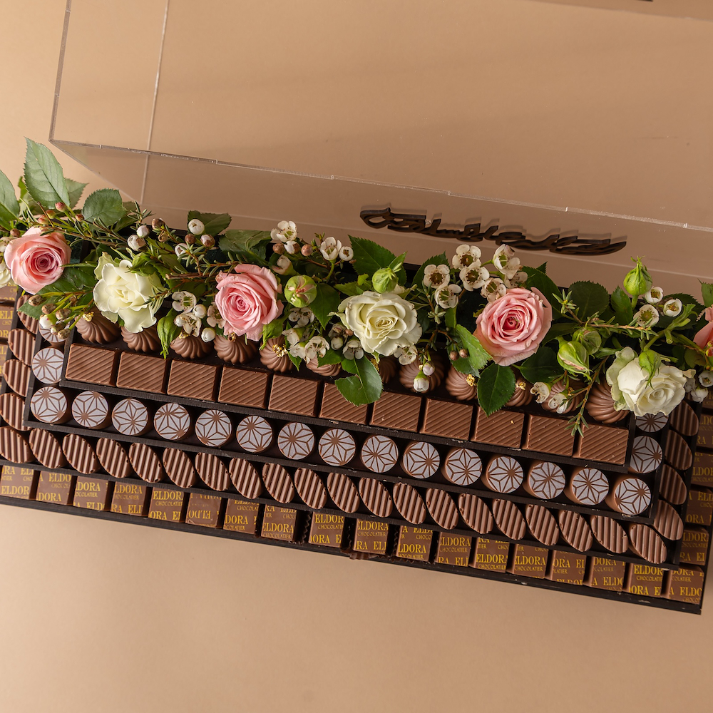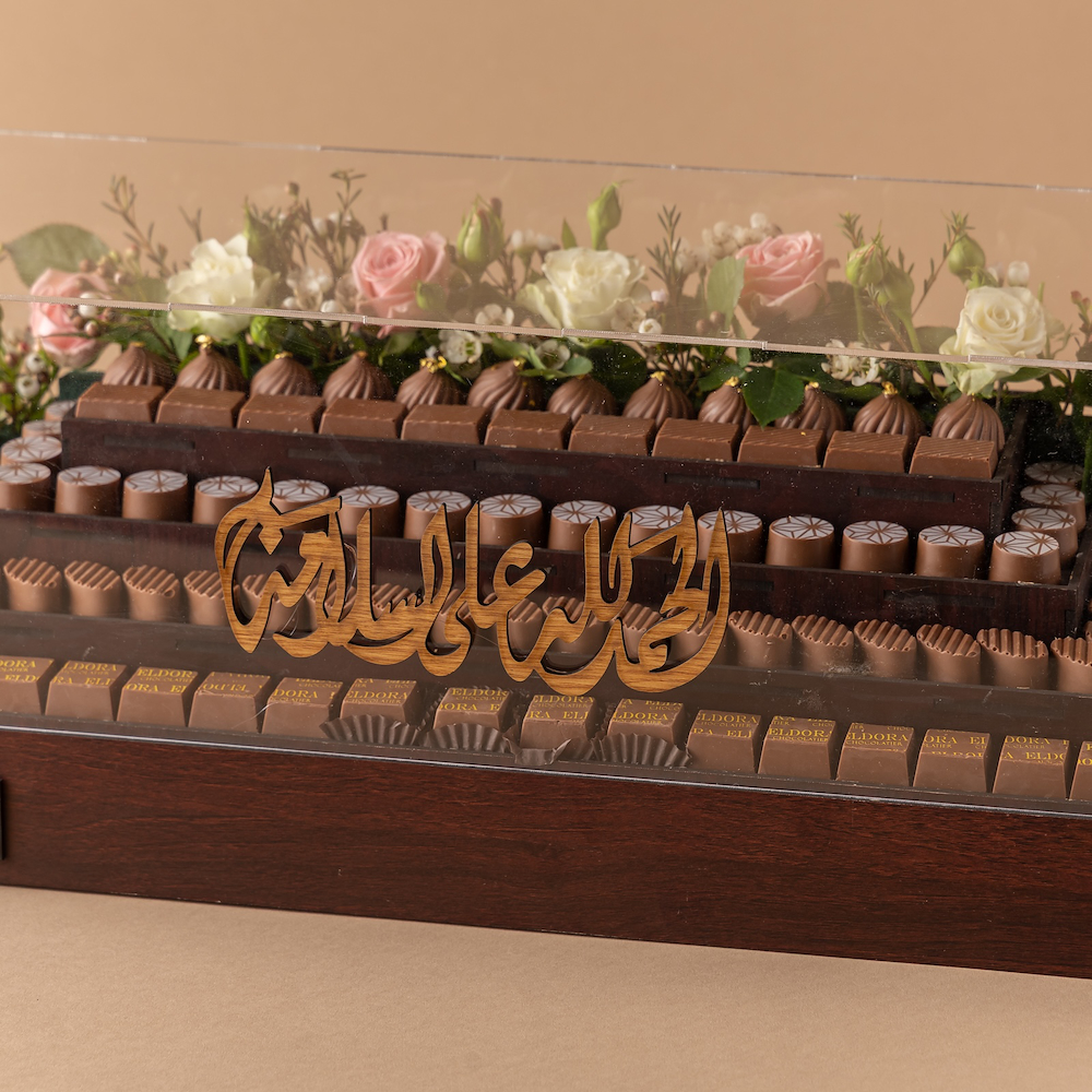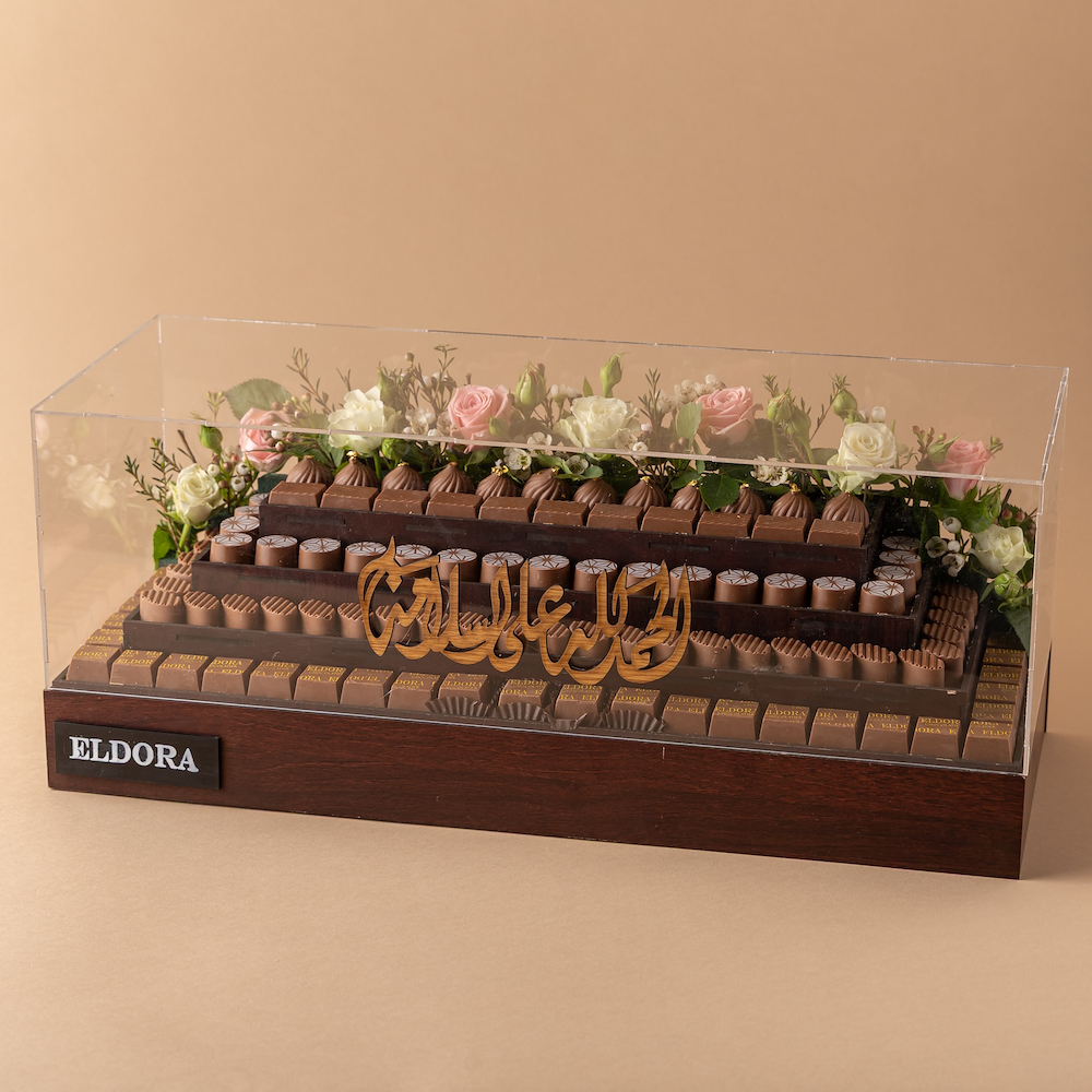 بوكس خشب راقي وفخم بلمسة أكريليك شفافة، مُزيّن بالزهور الطبيعية الوردية والبيضاء، وممتلئ بالشوكولاتة البلجيكية الفاخرة، مع عبارة خشبية “الحمدلله على السلامة” بتصميم أنيق. هدية راقية تُعبِّر عن مشاعر الاهتمام والامتنان بسلامة الأحبة.