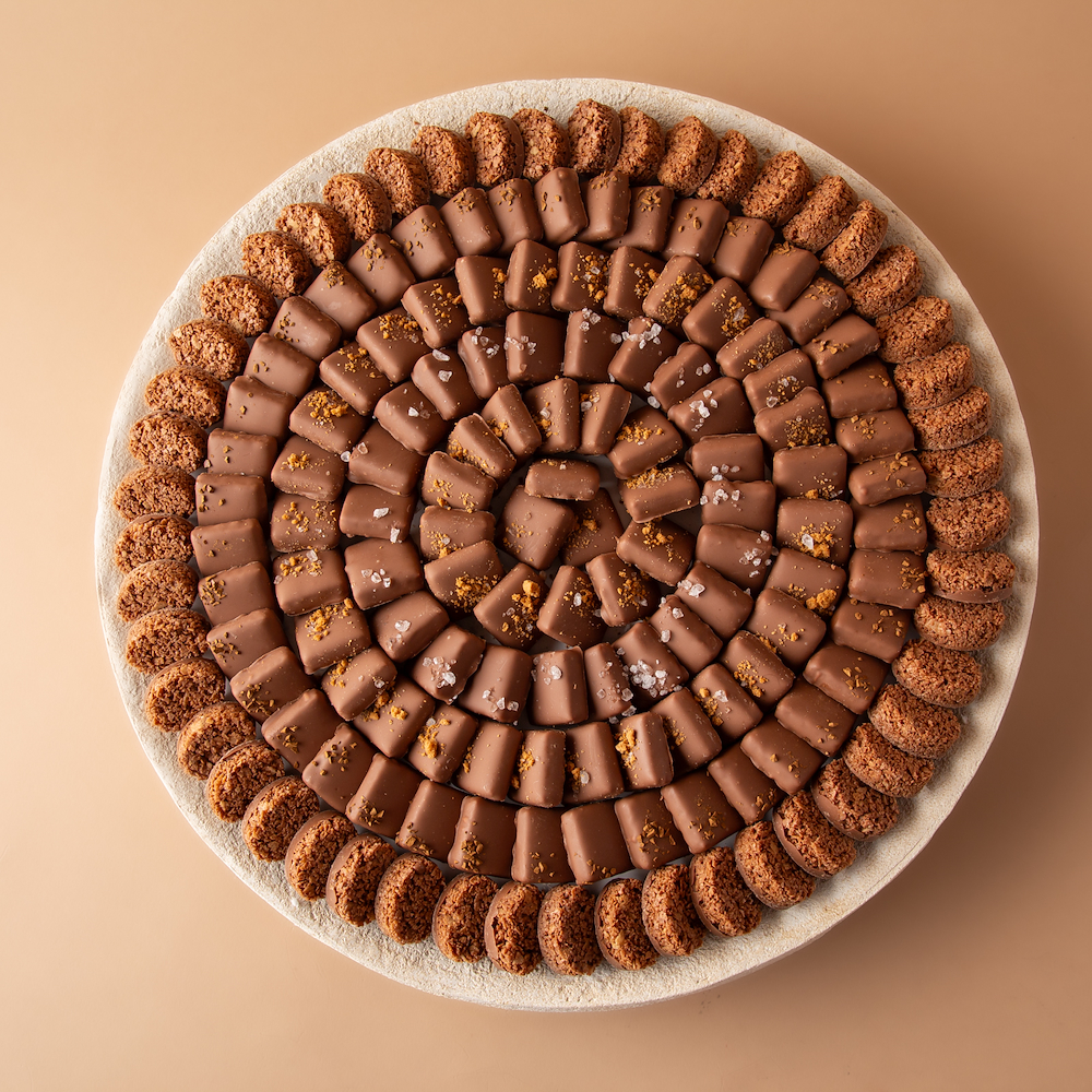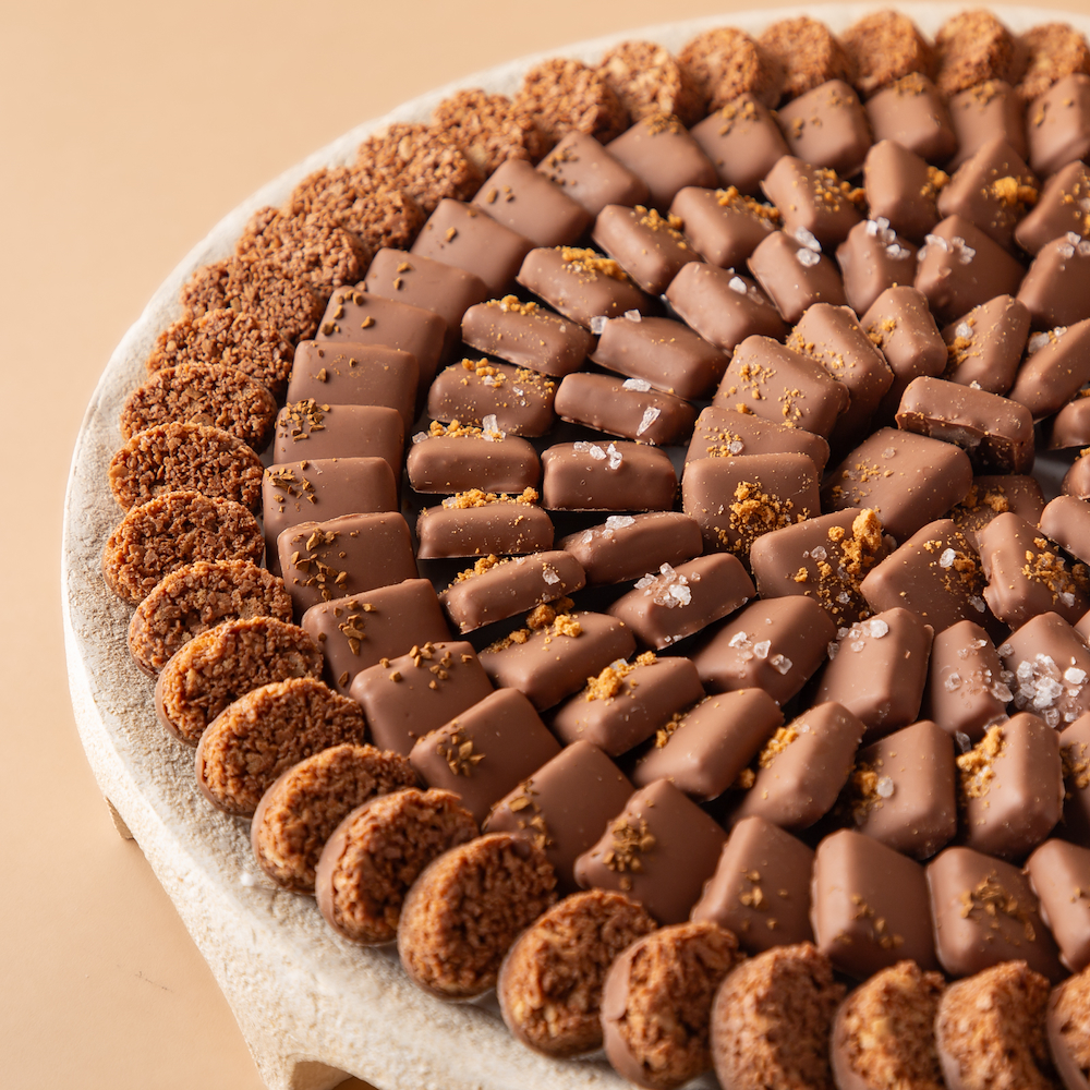 صينية فاخرة مصنوعة من الحجر، تحتوي على تشكيلة من الشوكولاتة البلجيكية الفاخرة بحشوات مميزة تشمل شوكو كرانشي، وفول سوداني مملح، وقهوة، وسالتد لوتس. ومزينة مع عبارة شوكلت حسب المناسبة. اختيار مثالي للهدايا الراقية وتقديم الضيافة بأسلوب فاخر.